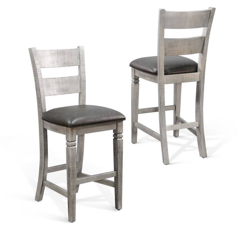 This 30" ladder-back barstool features a black vinyl cushion seat. Constructed with wire-brushed wooden frame legs and a stylish yet practical built-in footrest, this barstool was built to last.