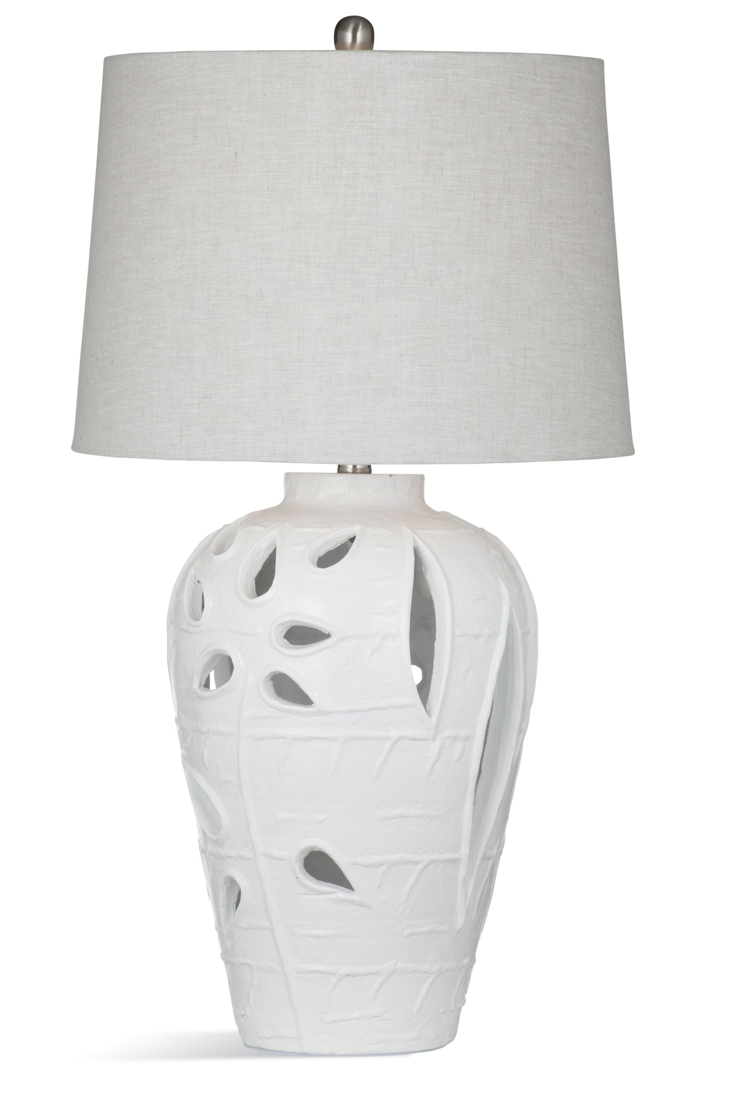 - The matte white resin base with floral carvings give the Amur Table Lamp a beaufitul boho style