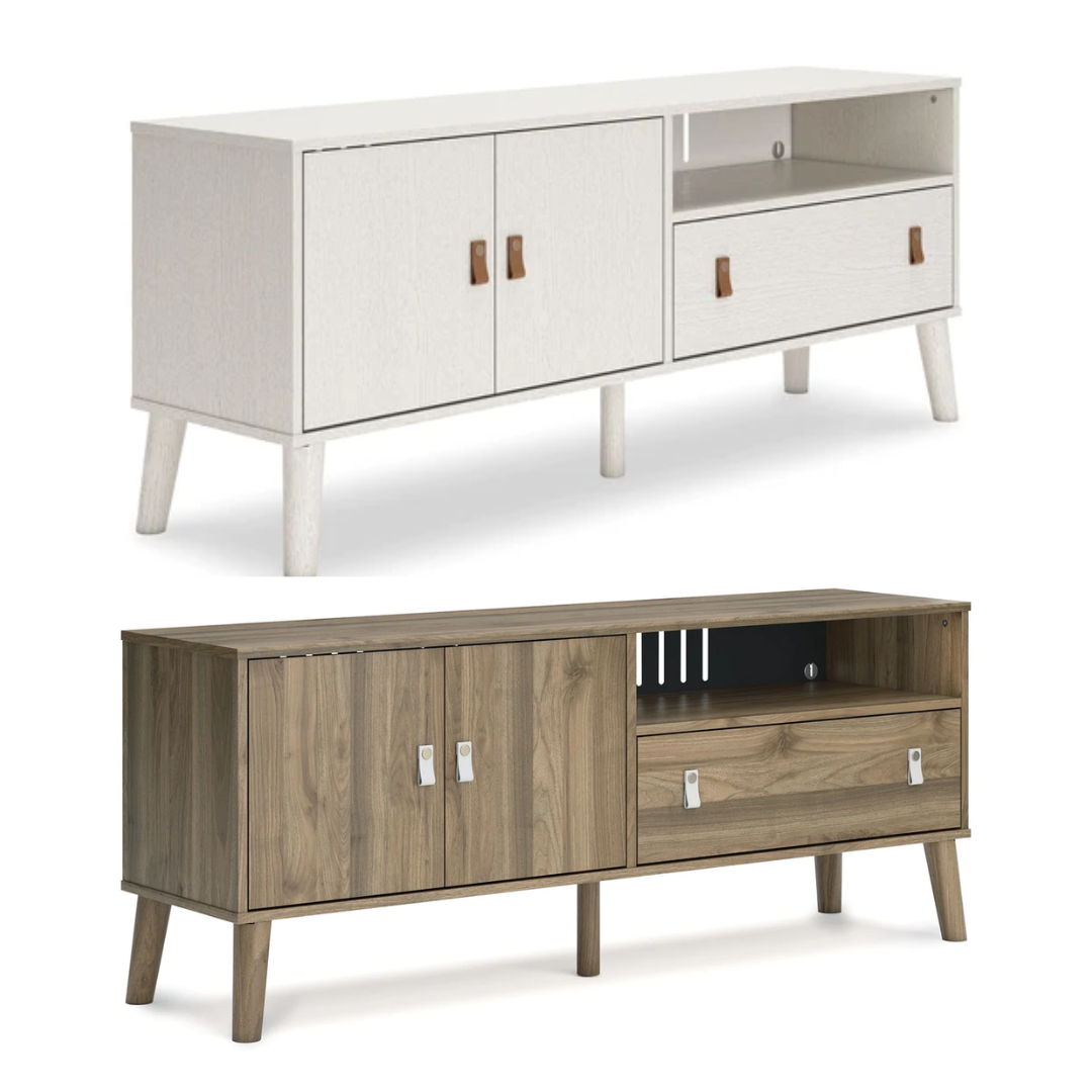 Dare to take minimalism to the max. This TV stand has an air of sleek simplicity thanks to its painted finish with subtle replicated wood grain. A drawer, open shelf and cabinet provide just the right amount of living room storage, while magnificently mod splay legs compellingly complement the streamlined design. And with two sets of faux leather pulls that allow you to customize the TV stand to suit your space, there's no doubt about it: this contemporary piece is sure to become a classic.