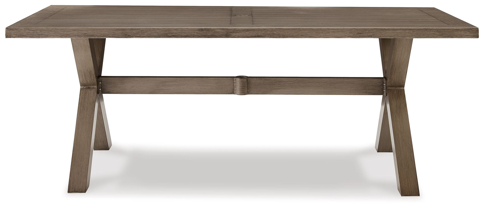 Balancing effortless natural beauty and minimalist design, this dining group seamlessly brings your contemporary style outdoors. The table sports a wood-look finish, it entices with its striking linear form. The chairs entice with its Nuvella® fabric that’s a breeze to clean. This sleek yet durably made set refines the art of relaxed outdoor living. Cushioned aluminum dining set. Wood look hand applied paint finish. High performance Beige Nuvella fabric.