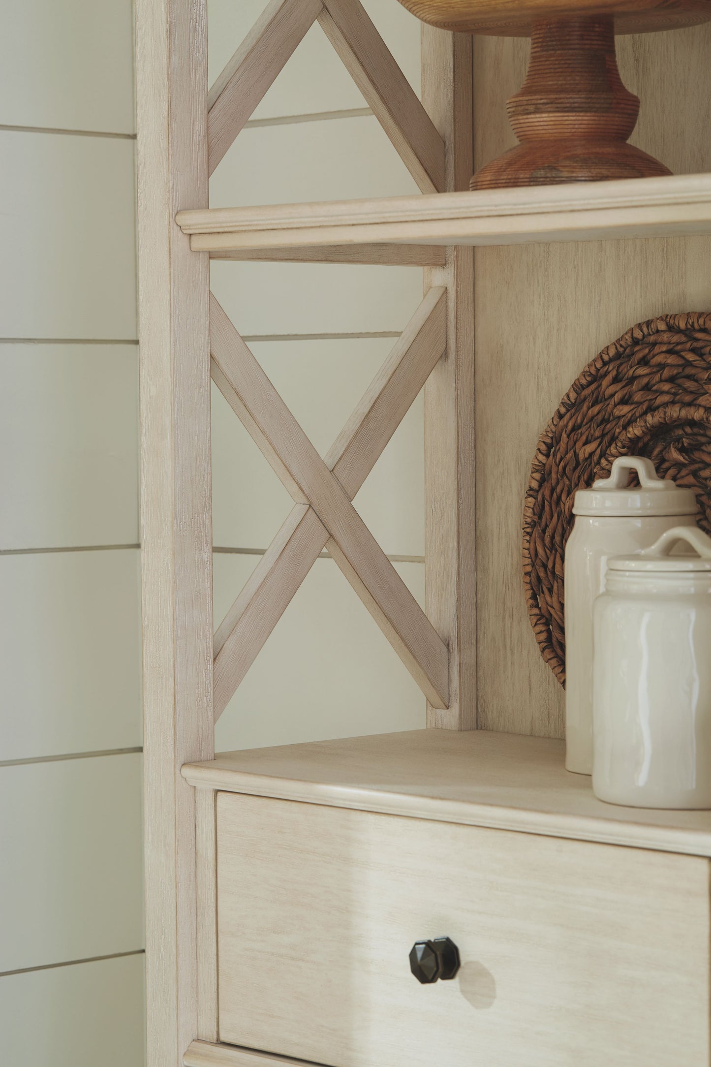 Need a stylish space to showcase dinnerware, pictures, decorations and more? This tall three-shelf display cabinet is a dream come true. The textured antiqued white finish provides a perfect backdrop for presentation. For the items you want to hide, there are two deep drawers. Embellished with the casual appeal of lattice sides, attractive crown moulding, clean lines and lightly distressed finish, this cottage-style shelf provides ample storage in such an artful way.