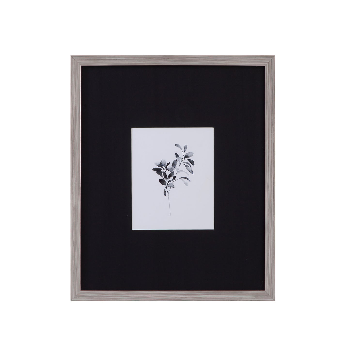 Brume Botanical I is a print framed in a silver tone 1" molding with a black matboard.