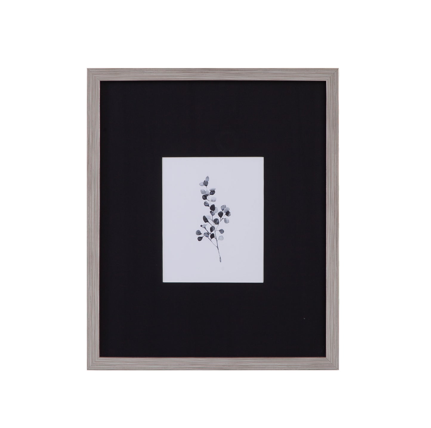 Brume Botanical III is a print framed in a silver tone 1" molding with a black matboard.