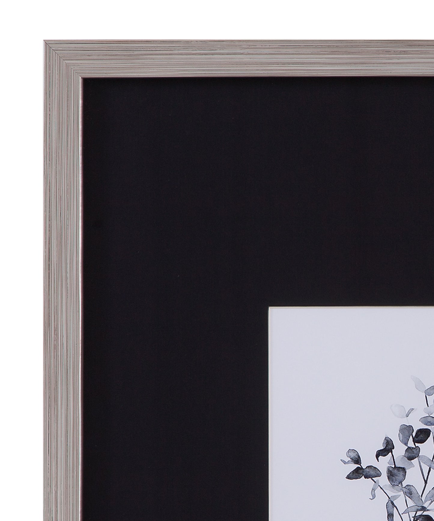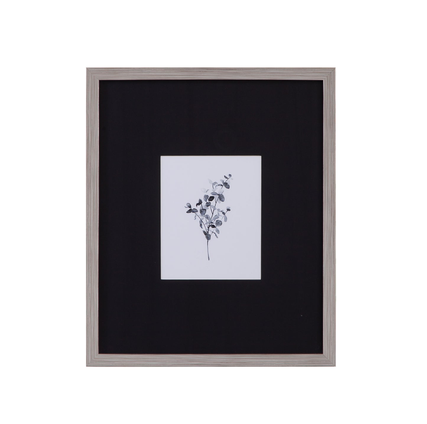 Brume Botanical IV is a print framed in a silver tone 1" molding with a black matboard.