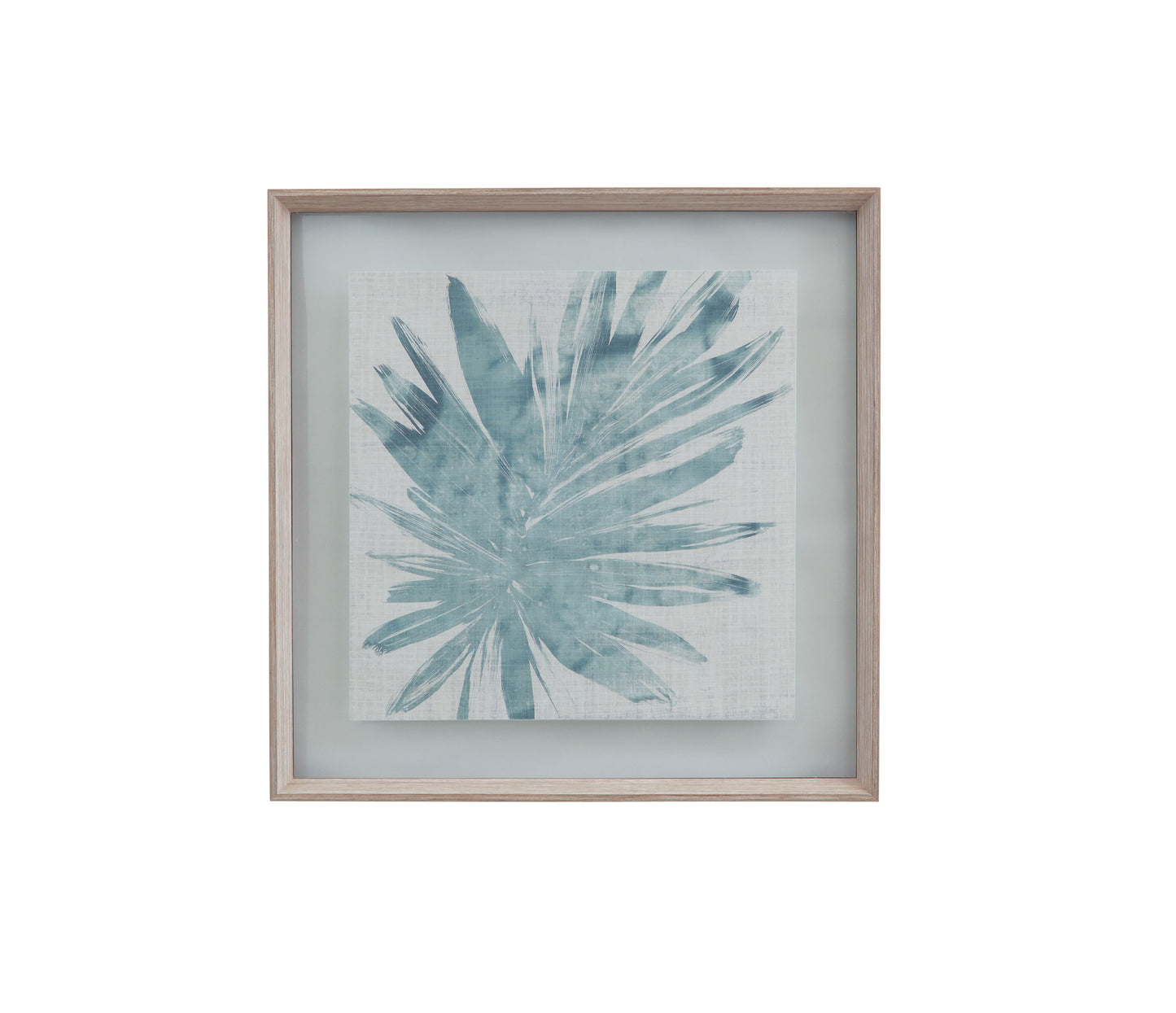 Burlap Ocean Palm III is a straight cut print floating in clear glass surrounded by a 7/8" weathered washed frame.