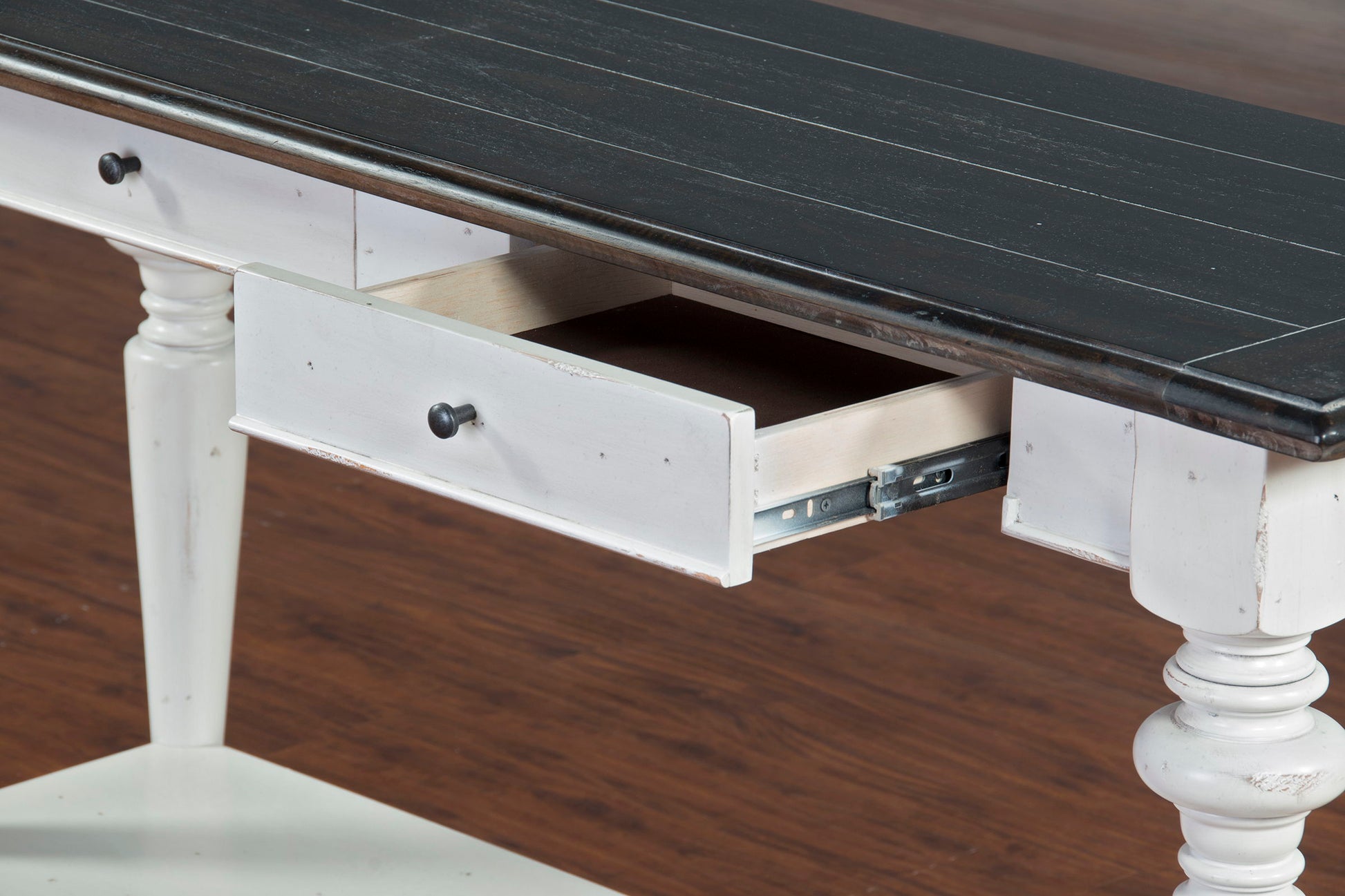 The Carriage House sofa table features European cottage styling in a warm, two-tone antique white and charcoal gray finish. This unique sofa table features a dusty wax hangup on the top and felt-lined, dovetail drawers. The distressed, white base with the turned legs complements the planked top. The lower shelf offers ample room for magazines, photo albums, and other decorative items. Sturdily constructed with mahogany solids and mindi veneers, the Carriage House sofa table will add warmth and charm to your space.