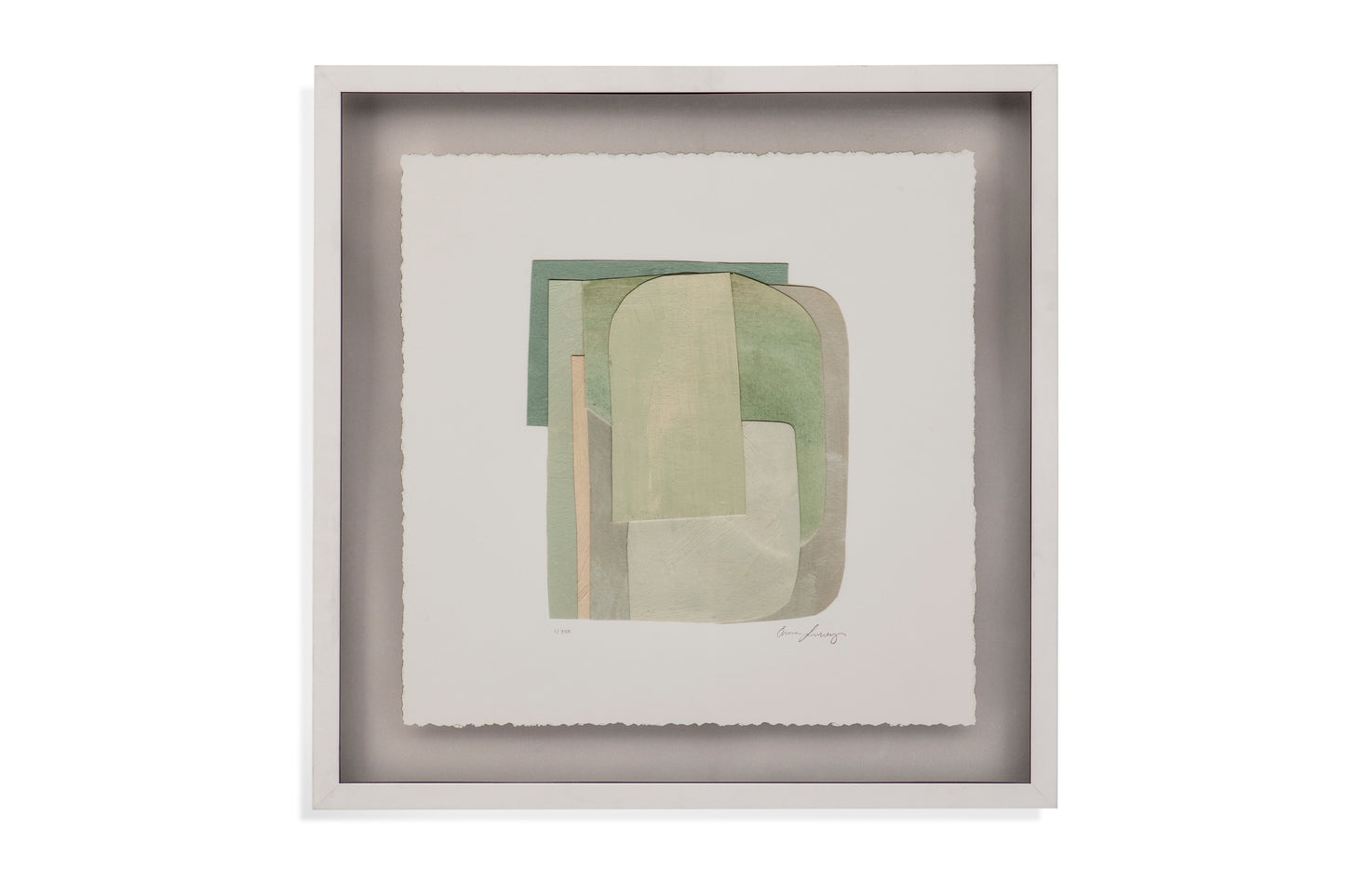 Color Structure IV features abstract shapes in pastel greens, blues and peach mounted to simulate floating print in a simple shadowbox frame.