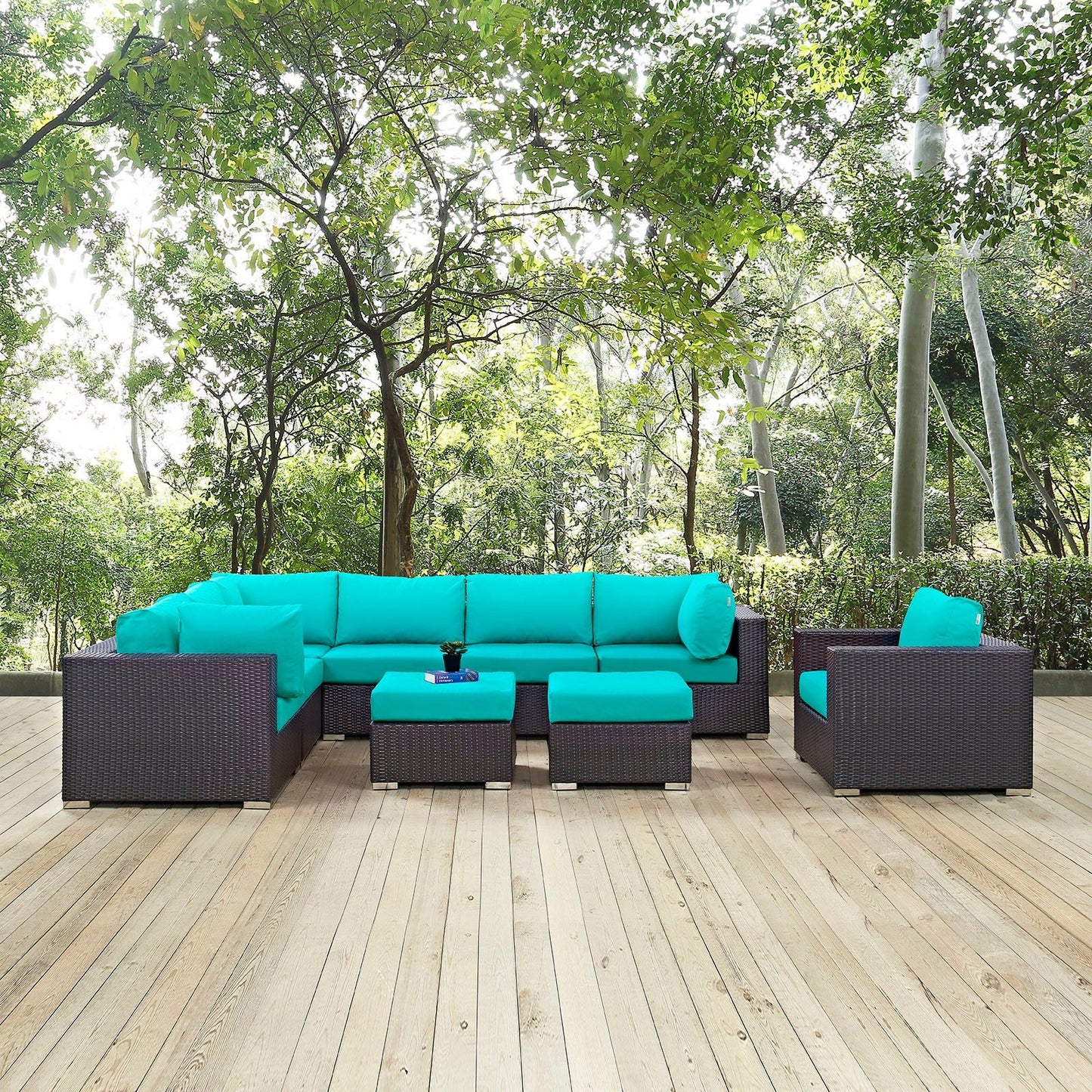 Gather stages of sensitivity with the Convene Outdoor Sectional series. Made with a synthetic rattan weave and a powder-coated aluminum frame, Convene is a versatile outdoor furniture set that shifts and combines according to the spontaneous needs of the moment. Outfitted with all-weather fabric cushions, leave a positive impression on friends and family while enhancing your patio, backyard, or poolside repast in this series of palpable distinction. This installment of the series is an Outdoor Patio Sectional Sofa Set.