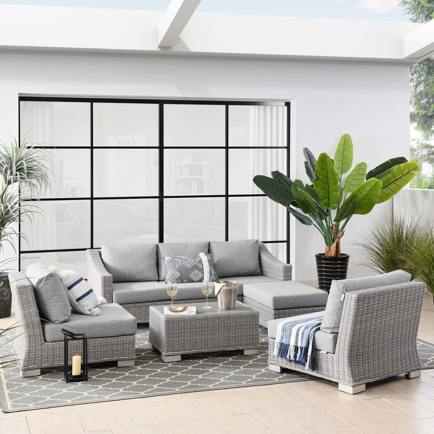 Enjoy fresh air and alfresco relaxation with the Conway Outdoor Patio Wicker Rattan 5-Piece Furniture Set. Wrapped in UV-resistant light gray synthetic wicker rattan, this patio furniture set boasts organic texture and a neutral hue that brings a calming presence to your outdoor space. The frames of this outdoor furniture set are crafted with durable powder-coated aluminum and rest on L-shaped legs with plastic foot glides. Thick foam padded cushions covered with removable, all-weather polyester fabric covers offer a comfortable seat and affix securely to the lounge chair with cord tension attachments. Trending aesthetics and a classic design define this outdoor patio furniture collection making it a beautiful addition to any outdoor space including the backyard, patio, porch, balcony, or poolside. Assembly required. Set Includes: Sofa, Ottoman, 2 Armless Chairs, Coffee Table