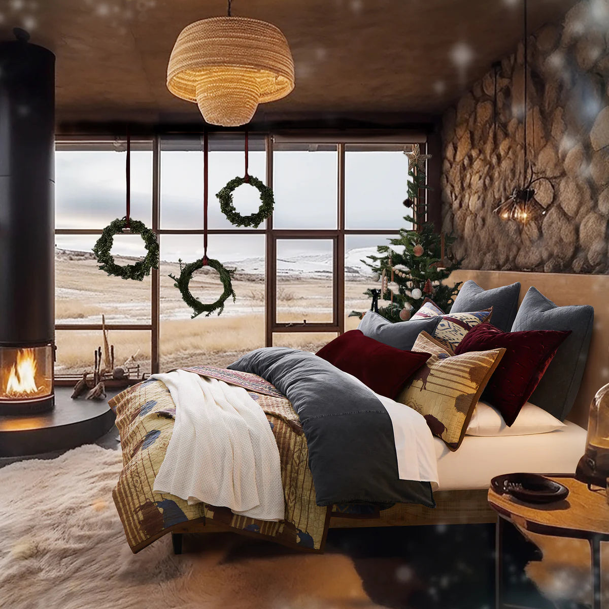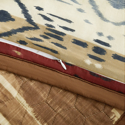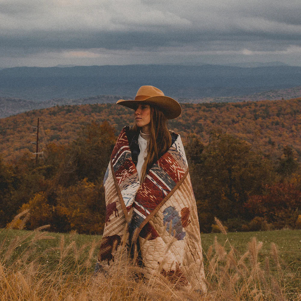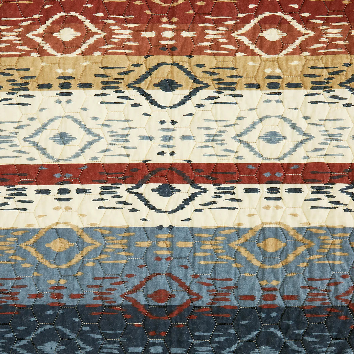 This quilt pays tribute to the once-thriving symbol of the American West: the majestic buffalo. Using colors borrowed from the earth and sky, we painted a buffalo herd roaming freely across a field of Aztec patterns. This quilt reverses to a geometric ombre design, interspersed with bold alternating stripes and flowing tribal motifs. Finish the look with other accessories from our range of Western and Southwestern collections.