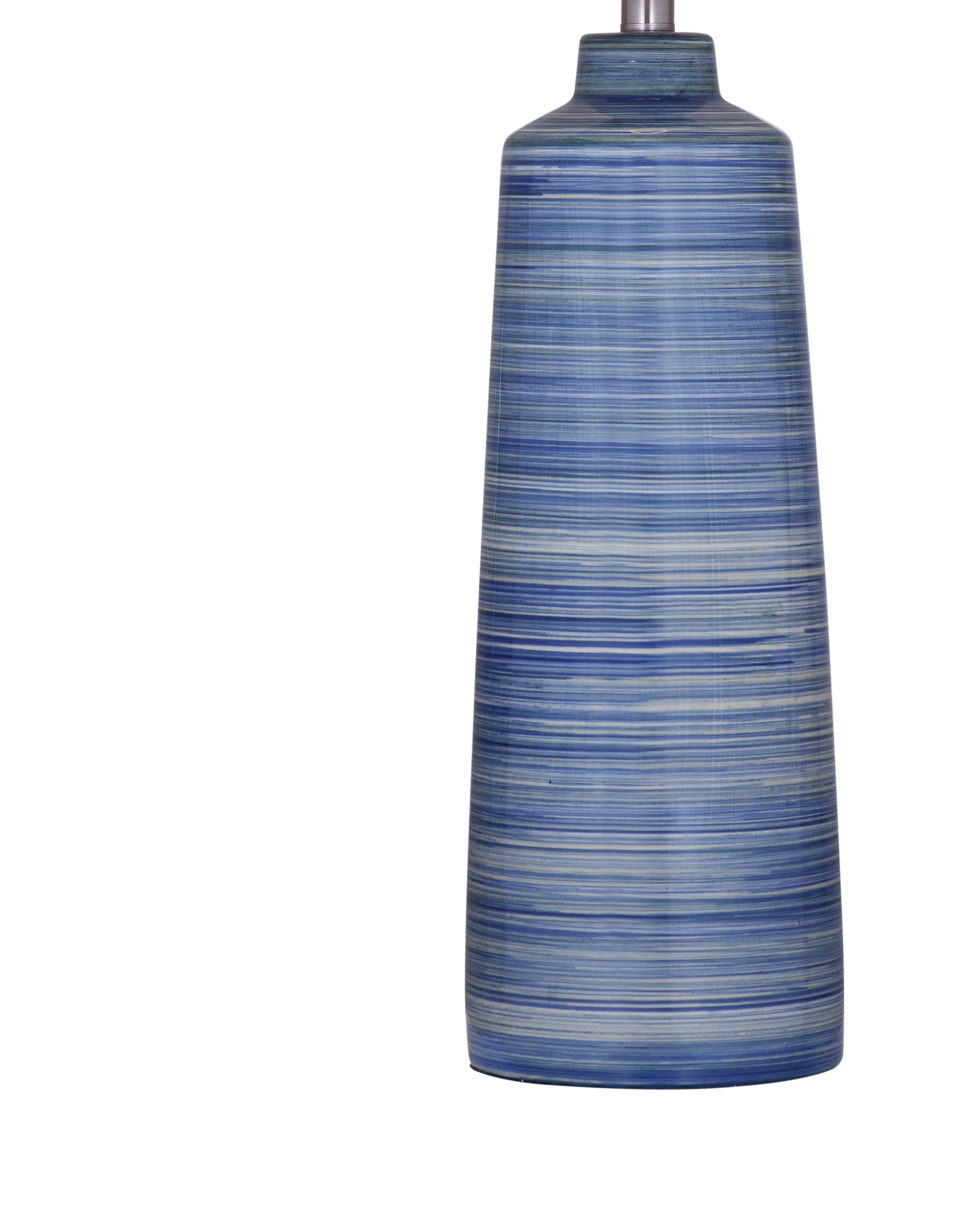 The Creedence Table Lamp features a ceramic body with a vibrant blue palette, layered in horizontal stripes that create a dynamic, textured look. The rich shades of blue evoke the rhythmic waves of the ocean, bringing a calming, yet striking visual interest to any space. Topped with a crisp white lampshade, the lamp provides a fresh contrast to the vivid body, making it a perfect accent piece for both light and airy interiors as well as more boldly decorated rooms.
