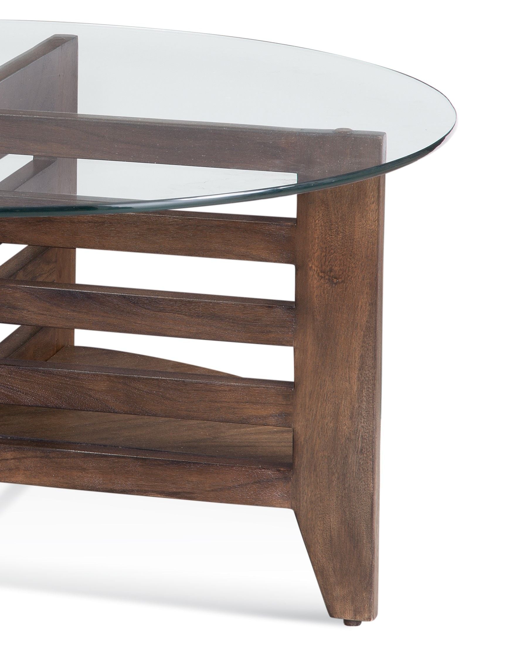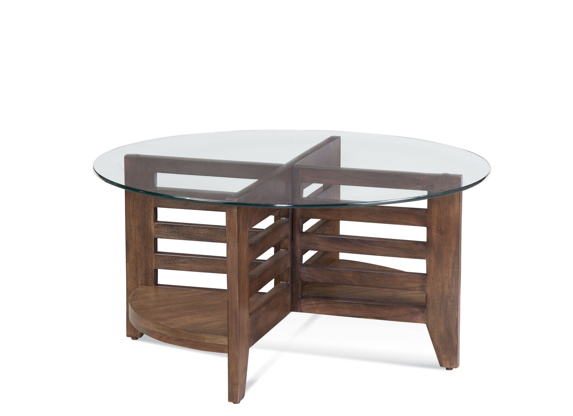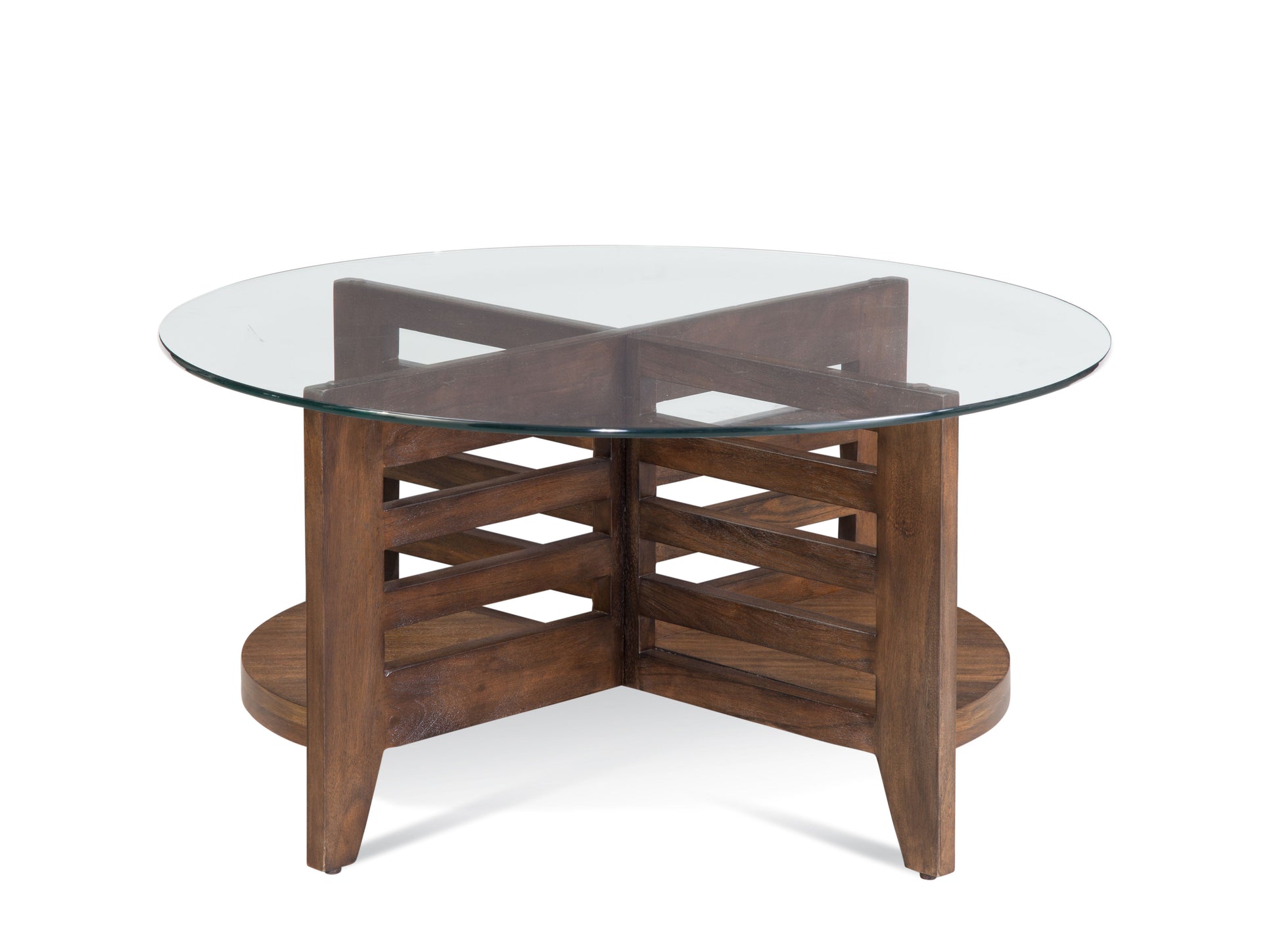 The Davi Cocktail Table features a Mid-Century styling, round glass top and an X base with open horizontal slat details and two quarter size shelves. Finish: chocolate. Material: rubberwood solids and acacia veneers, clear glass. Adjustable floor levelers.