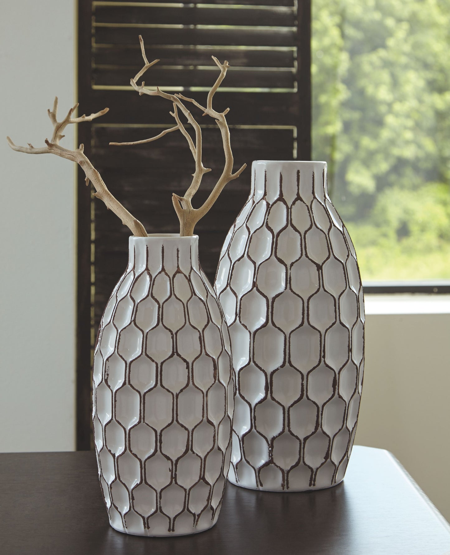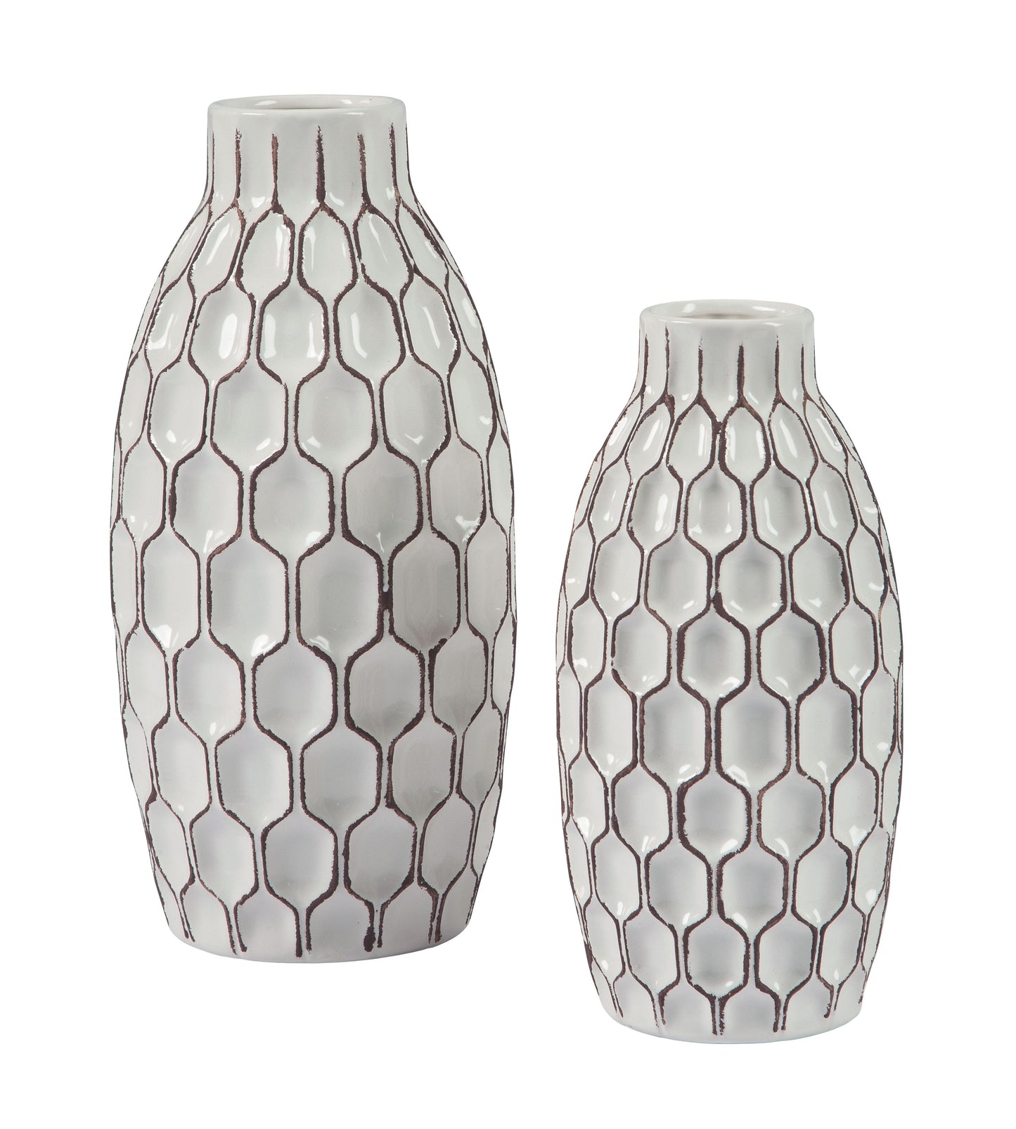 Put geometric patterns on repeat with this 2-piece vase set. Brown punctuates with indented hexagons for a multi-dimensional look.