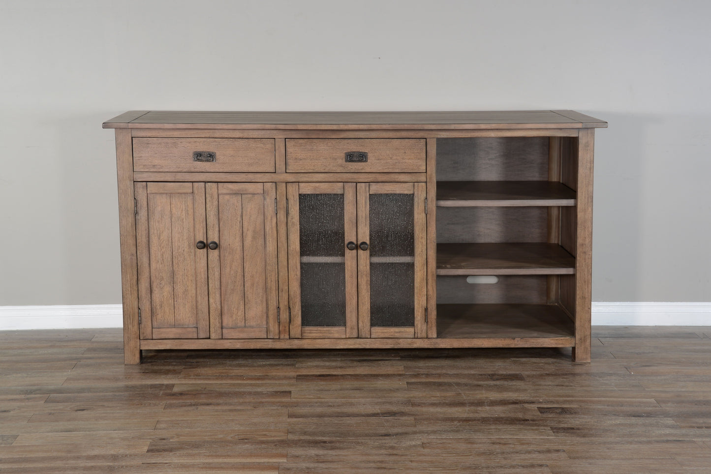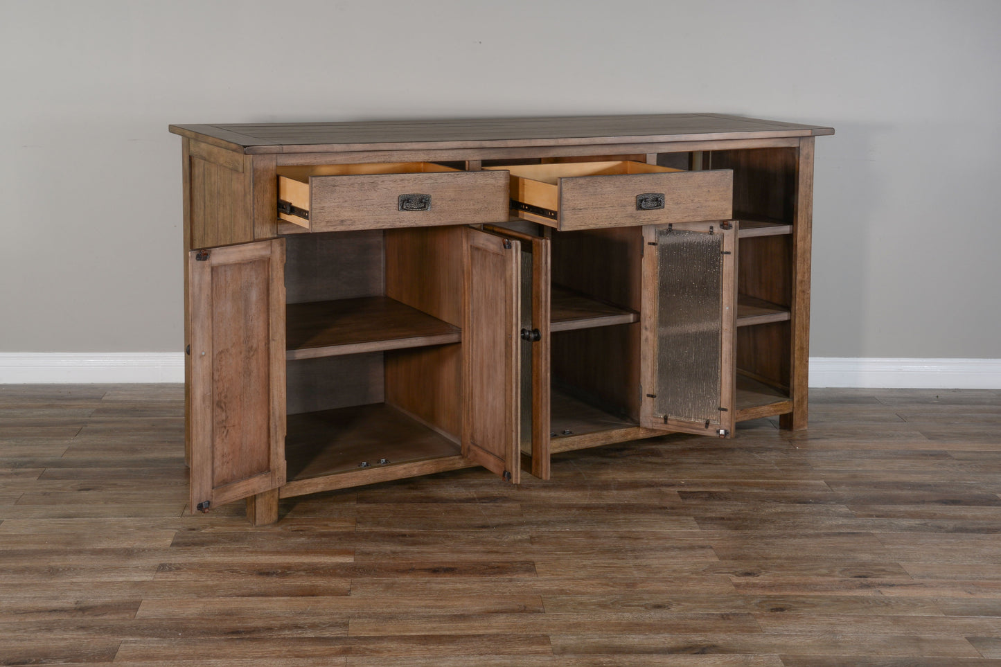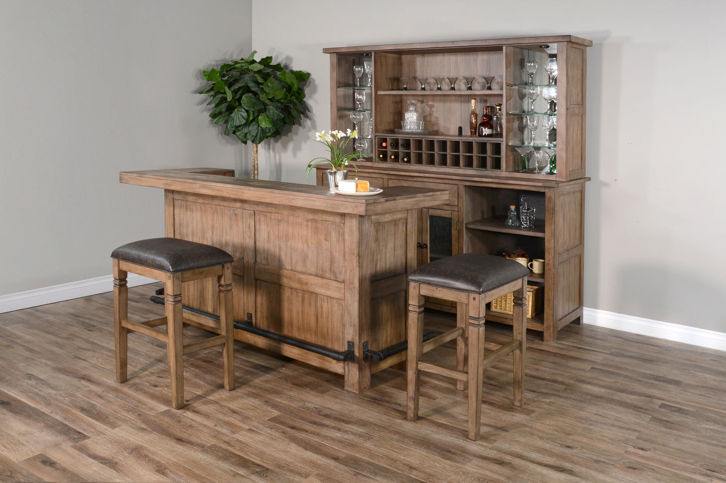 The Doe Valley back bar is the perfect addition to any home. Built with mahogany solids and veneers. Plenty of storage for wine bottles, a removable shelf for a 42" TV pocket with cord management, LED light, and six adjustable glass shelves.