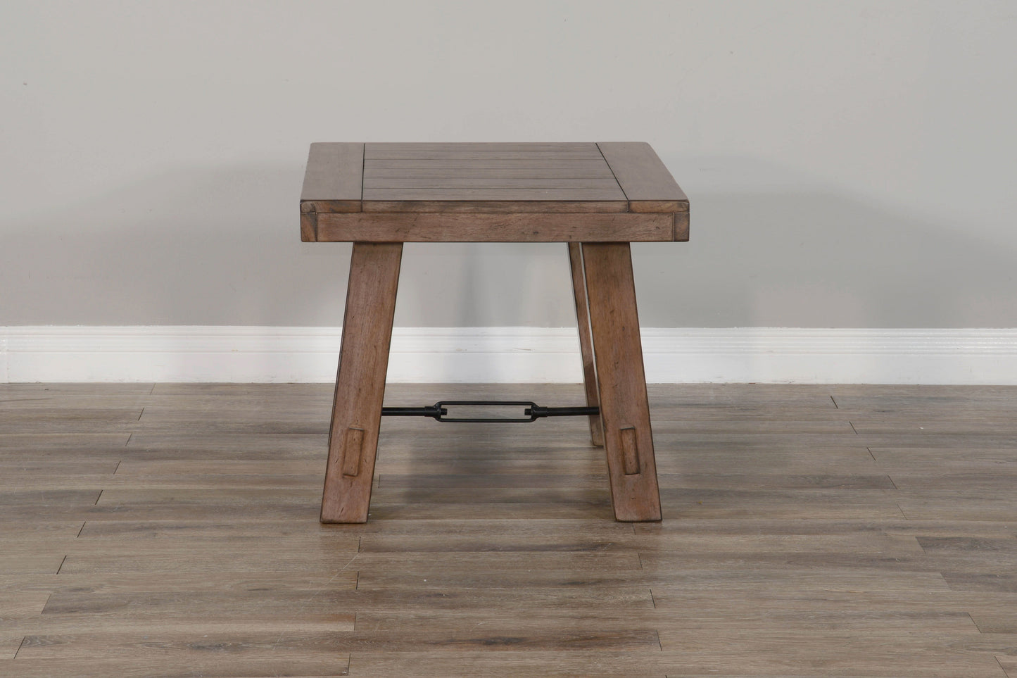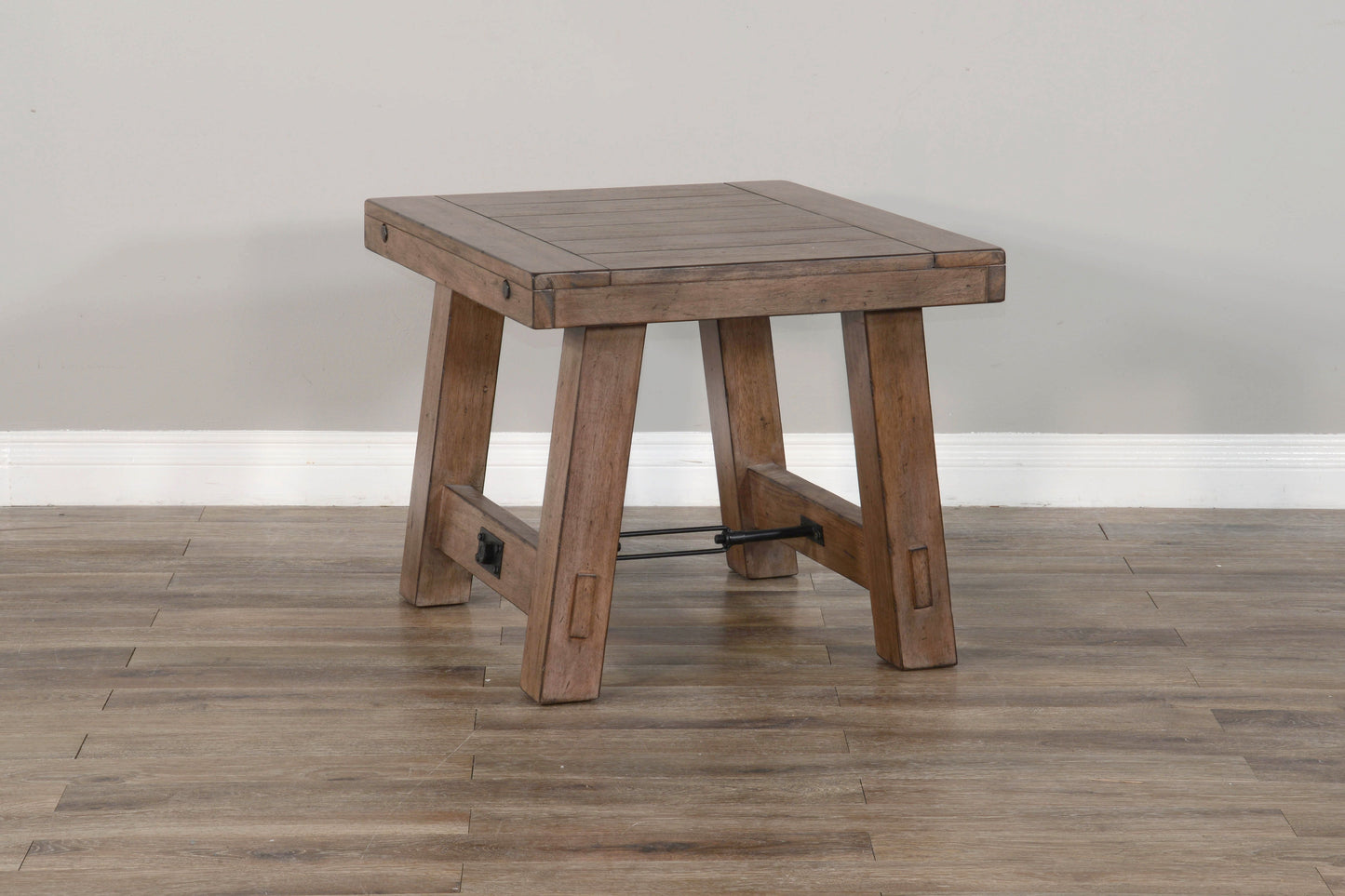 Made with mahogany solids and veneers. This dashing occasional table set is bold, beefy, and made to last. The antique turnbuckle and exposed hardware create a rudimentary industrial vibe accentuated by its robust design.