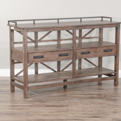 This server was crafted with mahogany solids and veneers. The metal rail and intricate framing give a unique feel and style that flows in every piece. Its design is elegant and sleek with two drawers for utensils and a metal backsplash.