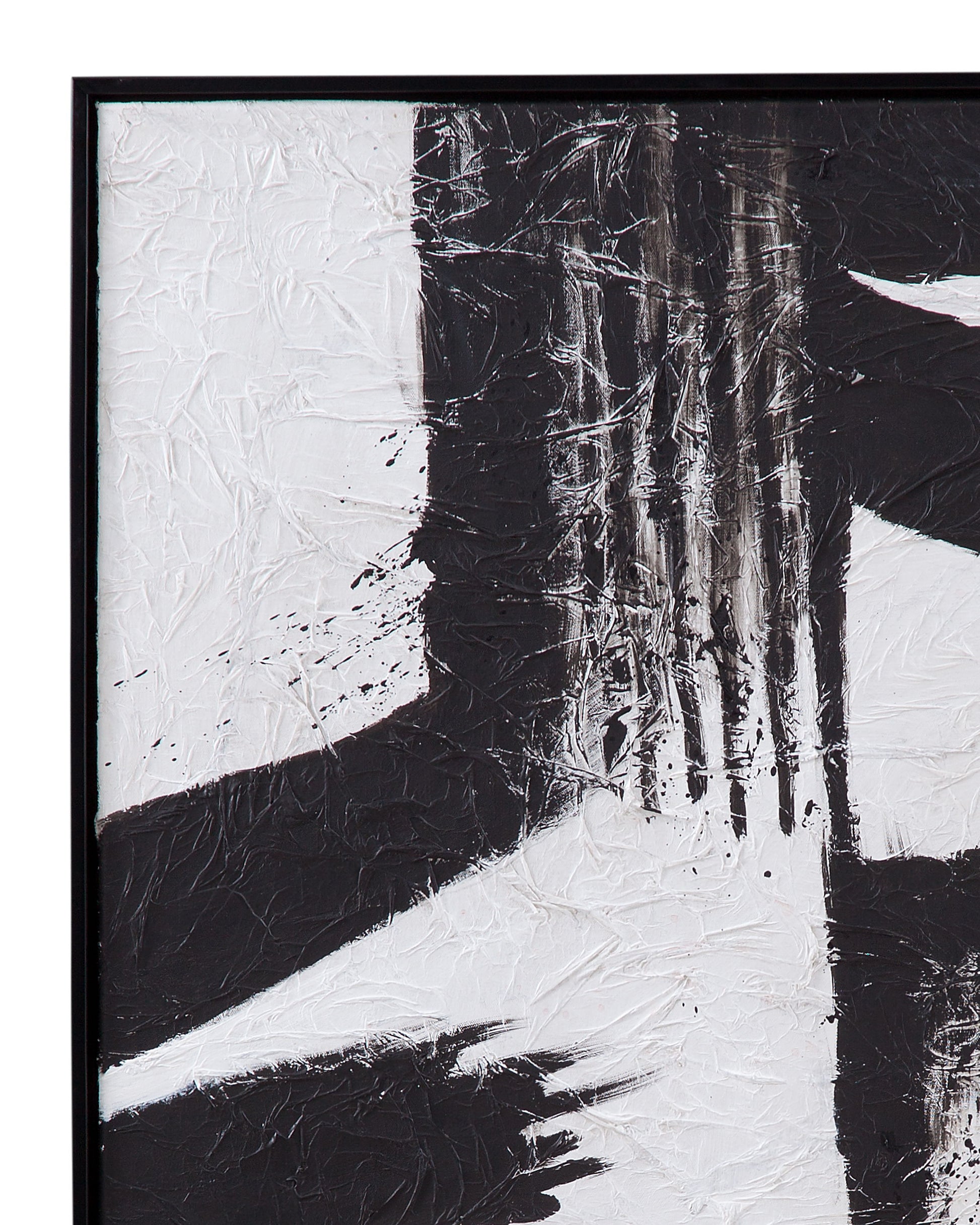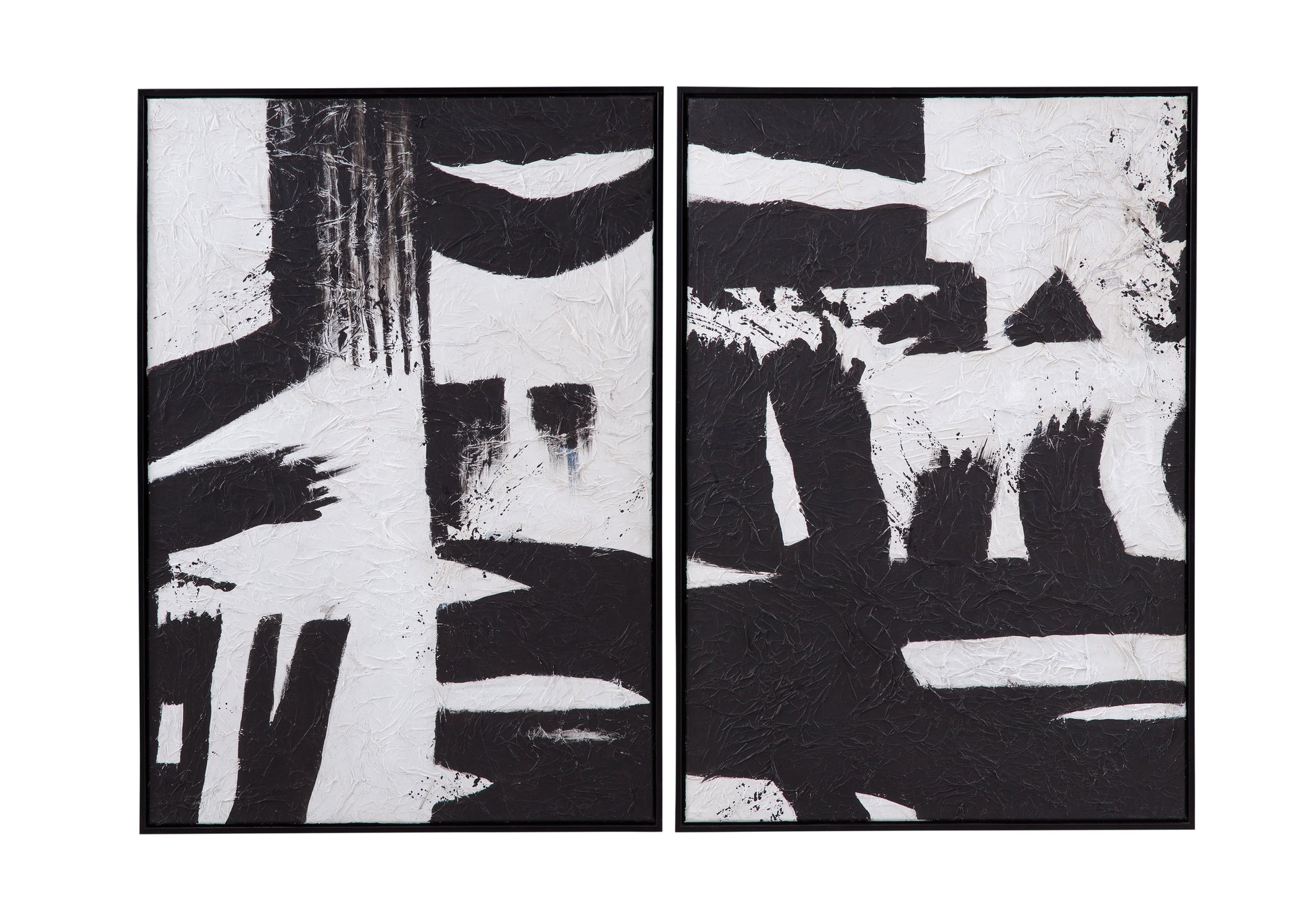 Black and White is a 2 piece set of hand painted framed canvases in a black molding. D-ring or sawtooth picture hanging hardware included. Finish: black frame. Material: canvas, fir, PS. This piece of art is hand painted by a skilled artist lending itself to a unique technique and will vary slightly. COO: China.
