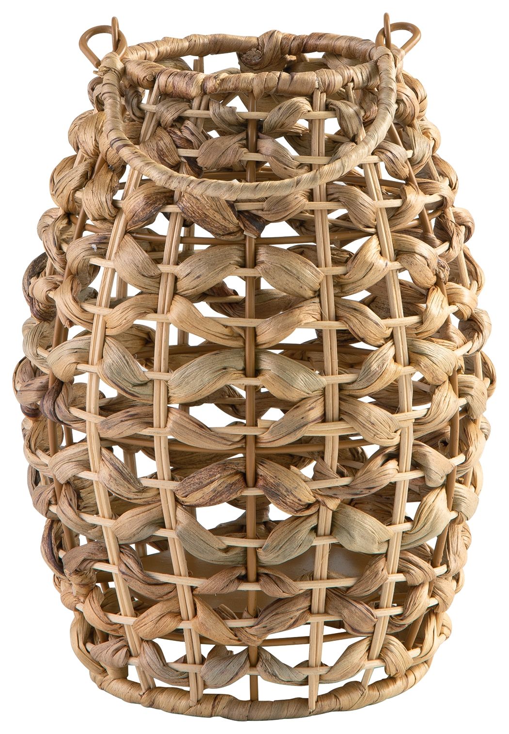 With its woven natural rattan and open-and-airy design, this lantern appeals to those turned on by a natural, bohemian sense of style. Holds one flameless pillar candle (not included).