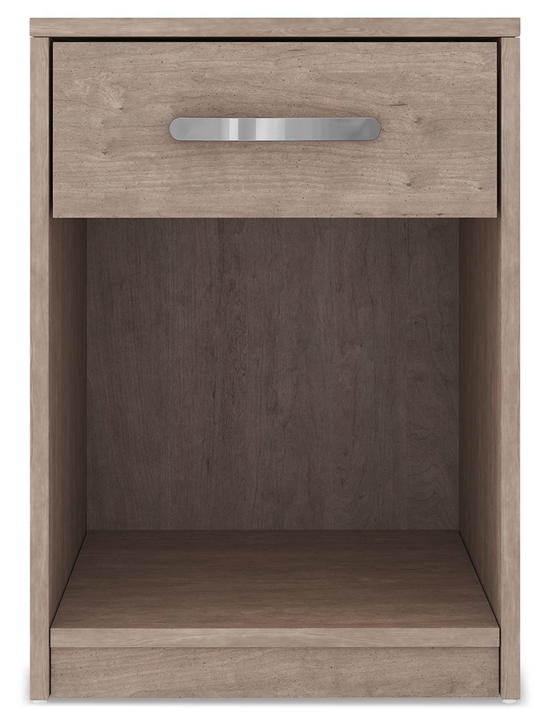Practical and attractive, this nightstand blends seamlessly with modern decor and makes a smart addition to a bedroom. The smooth-gliding drawer on metal ball bearings is ideal for bedside essentials. Open cubby provides a nice place for a storage basket or vase. Curved metal pull in brushed nickel-tone finish adds to the streamlined aesthetic. Combine with other units in the collection to create a room that’s sleek and stylish.