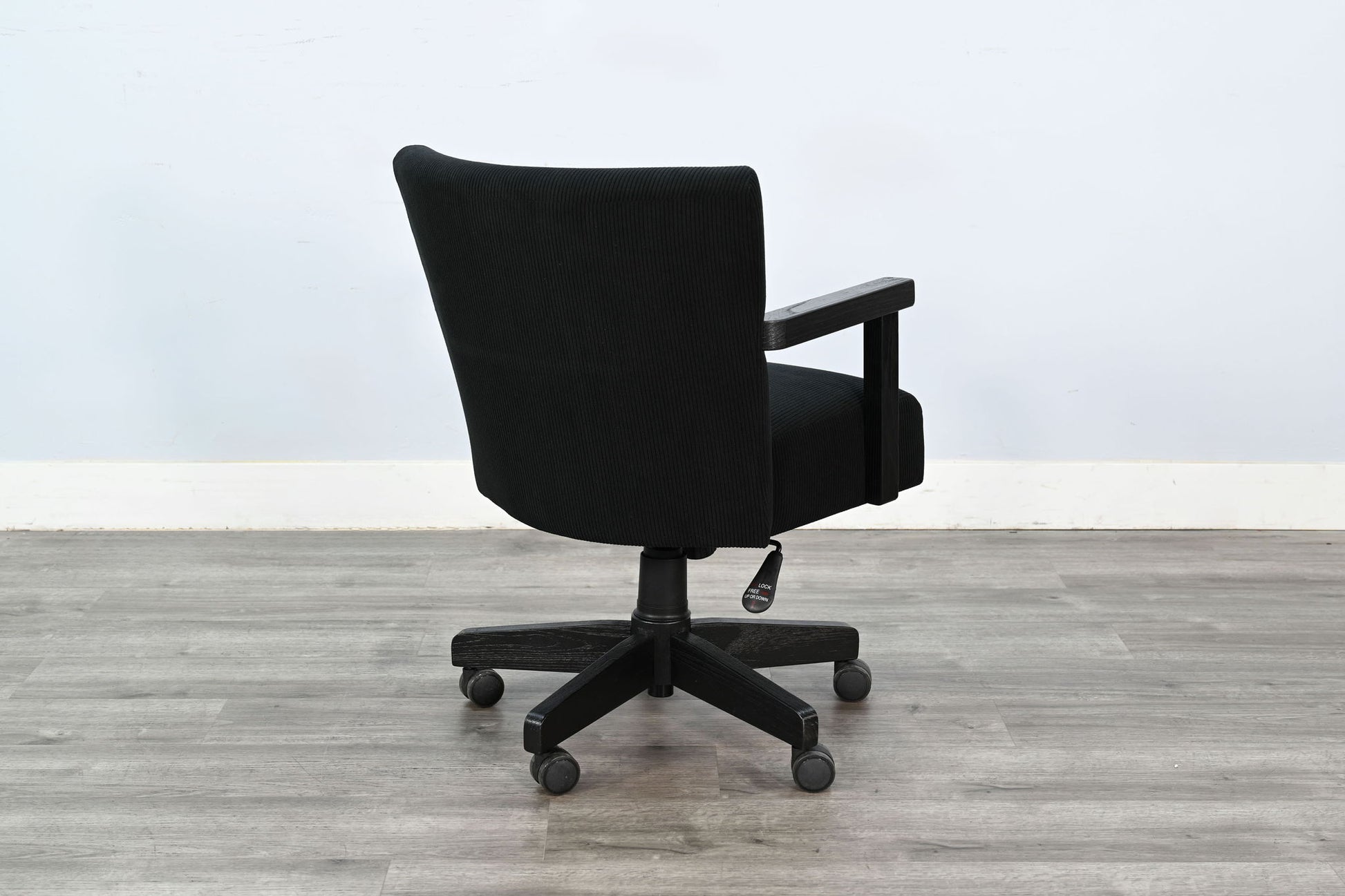 Bring comfort and character to your workspace with this Corded Swivel Office Chair, featuring a perfect blend of modern utility and rustic charm. Upholstered in a textured black corduroy-style fabric, the seat and backrest offer plush support with a refined feel. The lightly washed oak arms and base add a warm, natural contrast while maintaining durability and style. Complete with smooth-rolling casters and an adjustable seat height, this chair is designed to support your productivity in comfort and style.
