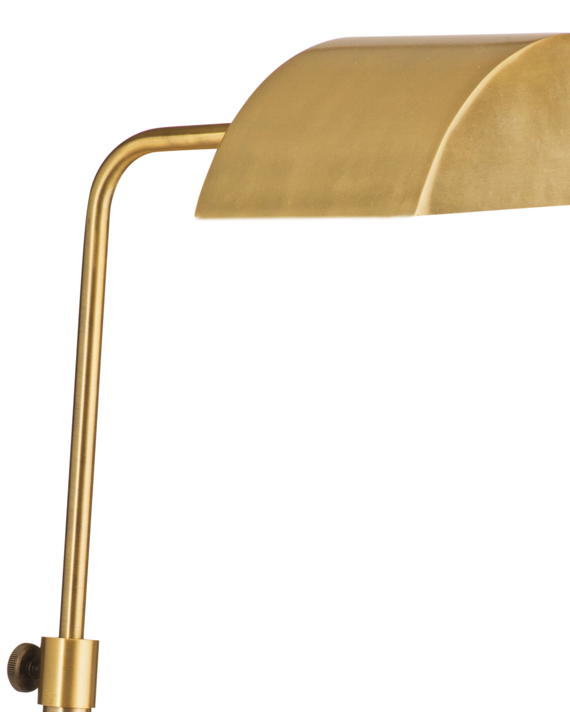 The Golden Desk Lamp showcases a sleek and minimalist design, constructed from brass metal for a touch of understated elegance. Its modern style is characterized by clean lines, a smooth, curved shade, and a sturdy, geometric base. The lamp's golden hue emits a warm, inviting glow, perfect for contemporary office spaces or as a stylish accent in a modern home interior.