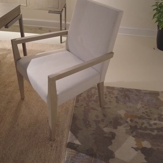 The Hekman Scottsdale Mindi Wood Upholstered Dining Armchair is crafted from Mindi veneer and solids. The stylish split upholstered back with a tapered profile is upholstered in a soft linen fabric with a white-taupe finish. The chair stands 25.5 inches from the floor to the top of the arm. Perfect for any dining room.
