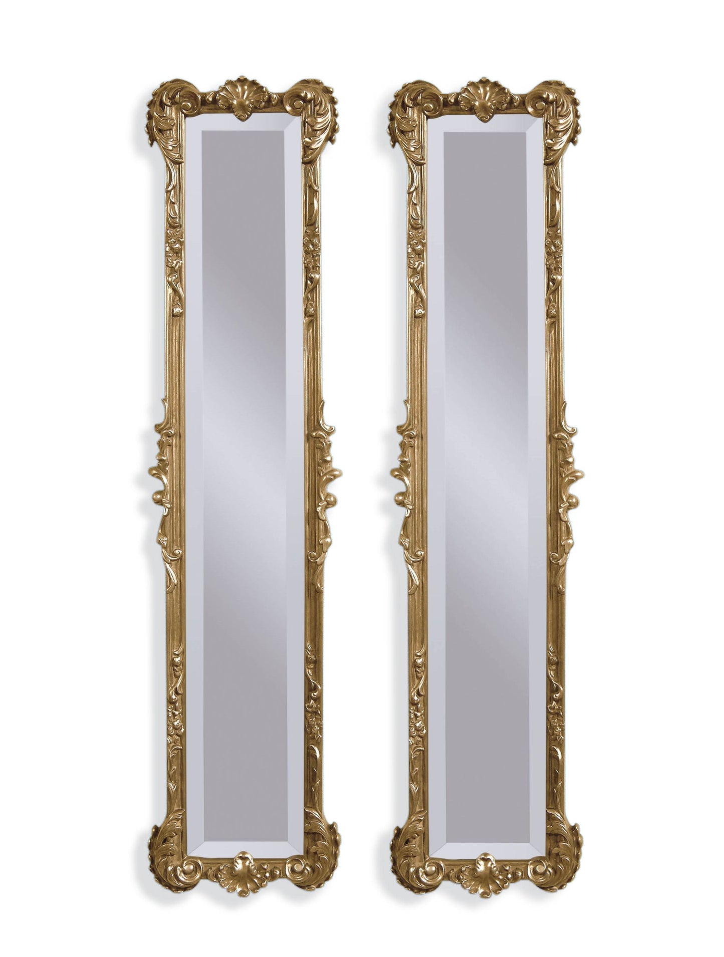 The Helena 2 Panel Mirrors boast a stunning gold leaf finish and French-inspired frames adorned with grand acanthus leaves, adding a regal touch to any living space. Perfect for traditional styling, this mirror set features ornate frames with intricate detailing in gold. With beveled mirrors, these panels effortlessly enhance the elegance of your decor.