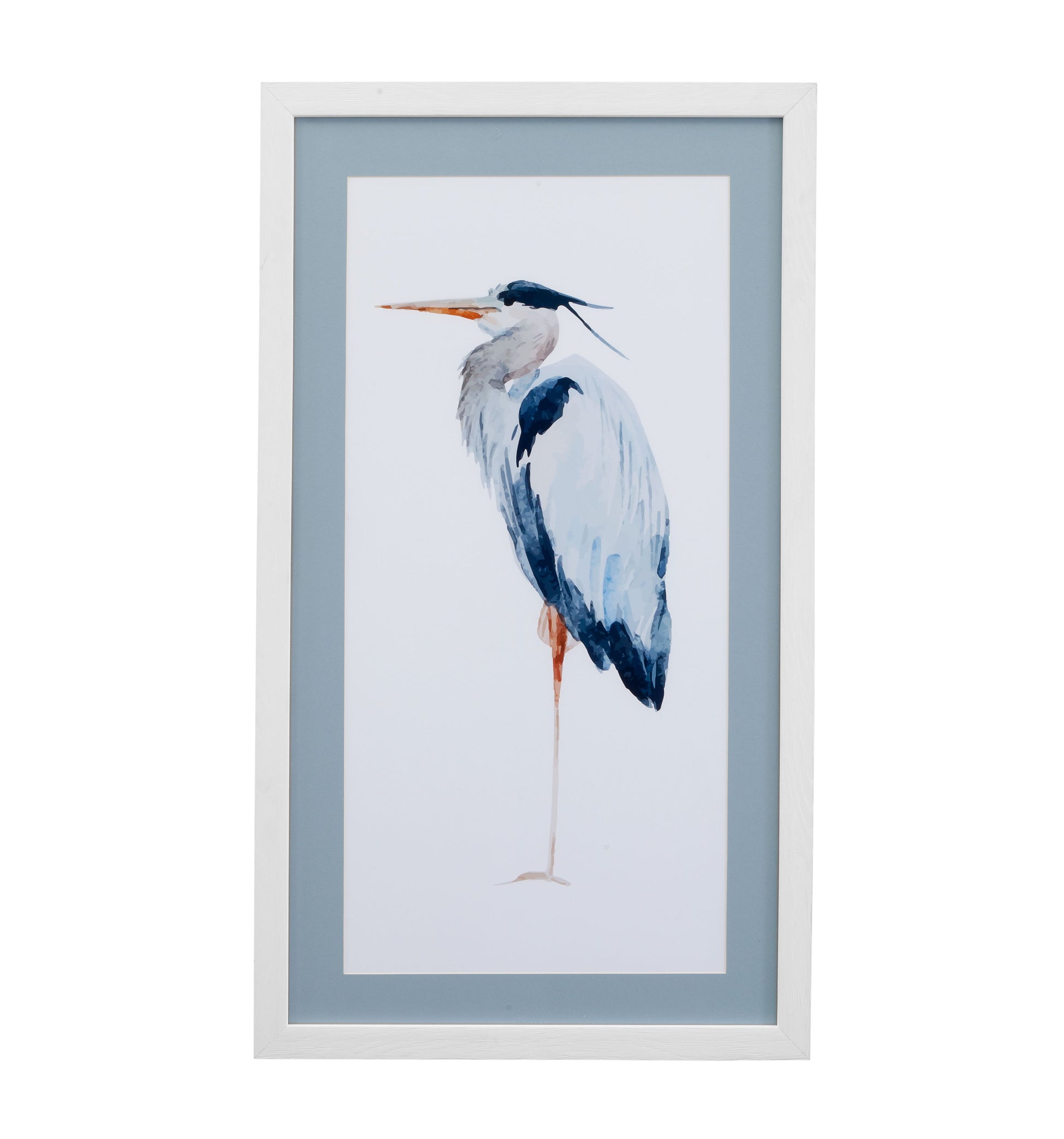All framed under glass art is built to order in our warehouse in Bassett, VA. Please allow 3 weeks for shipping once your order is received. Heron III features a blue mat board and a 1. 5" white wood molding. D-ring or sawtooth picture hanging hardware included. Material: Wood, Mat Board, Clear Glass. Made in the USA.