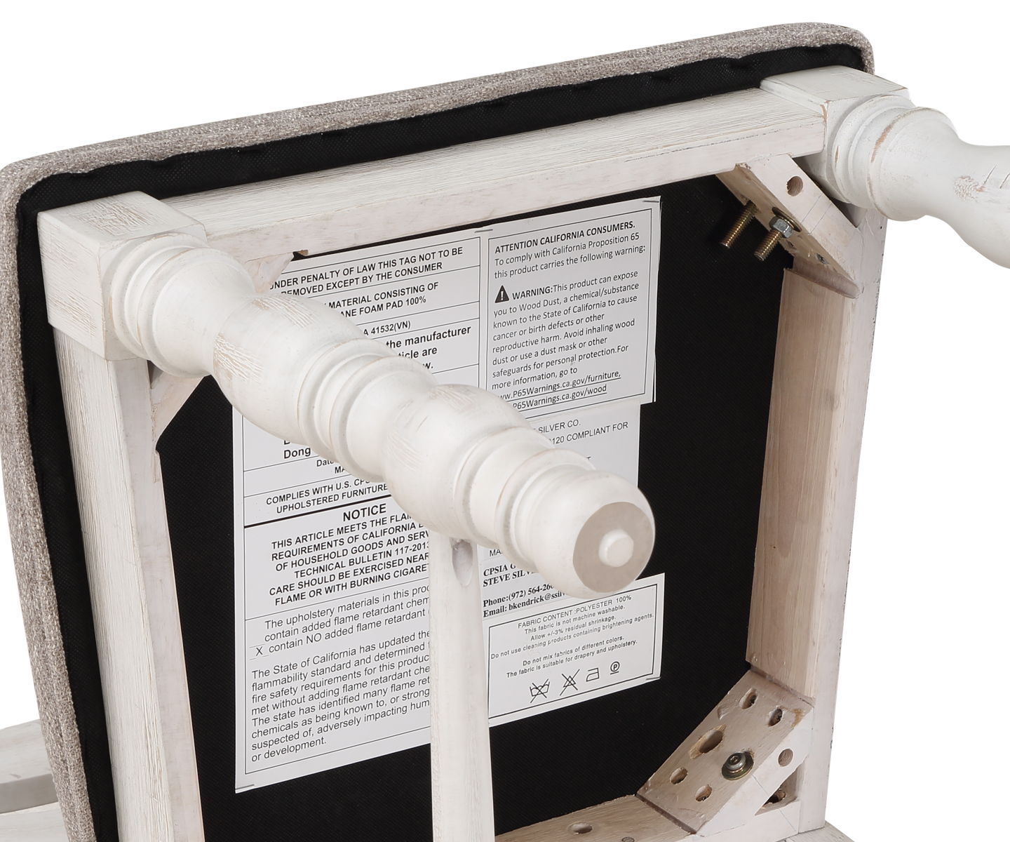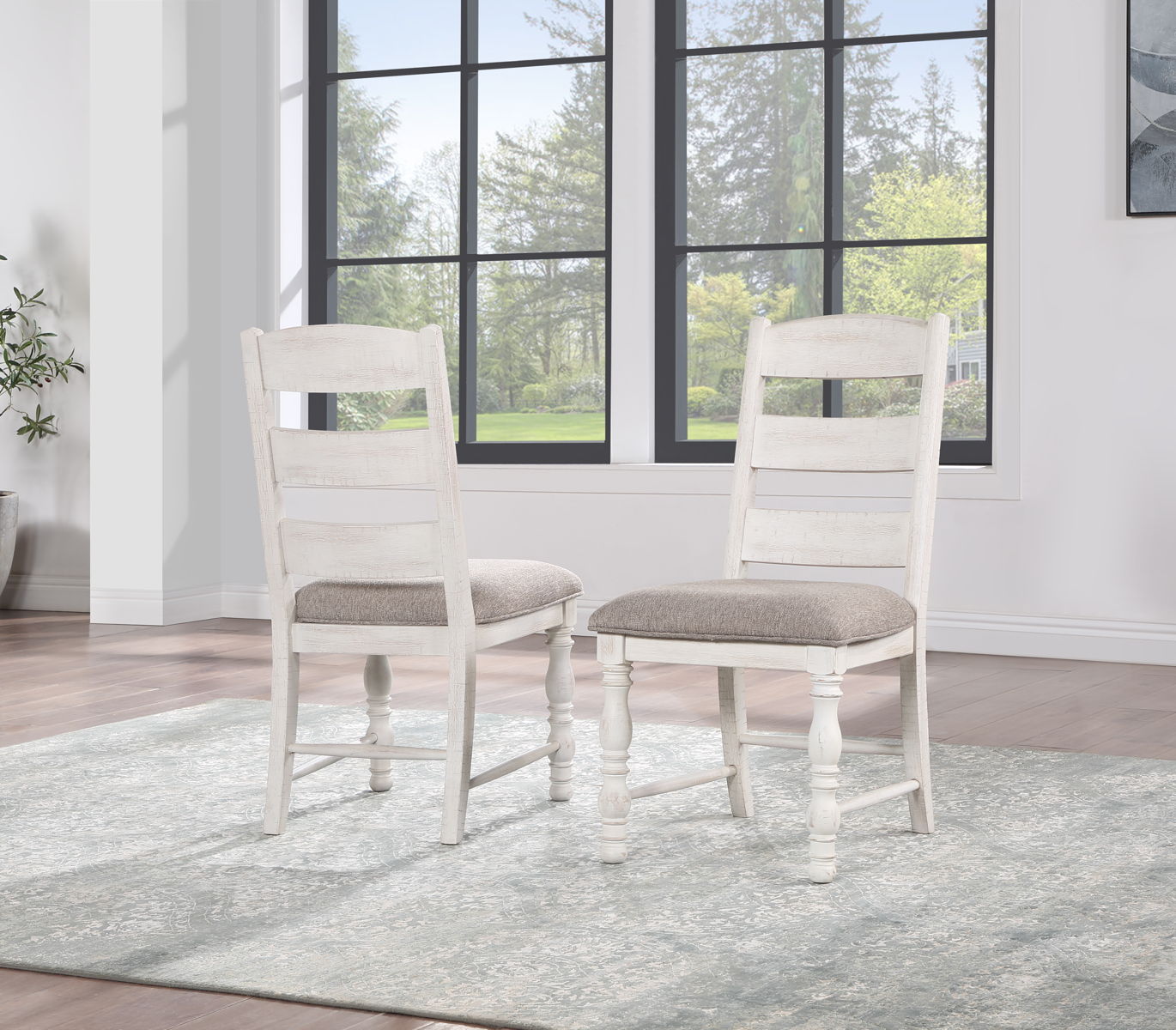 English country styling with sturdy teardrop leg turnings and a classic Ladderback design. A weathered white finish adds a touch of vintage styling to the chair while relaxing the design for today's lifestyles. An upholstered seat updates the chair's English pub look with the comfort everyone will appreciate