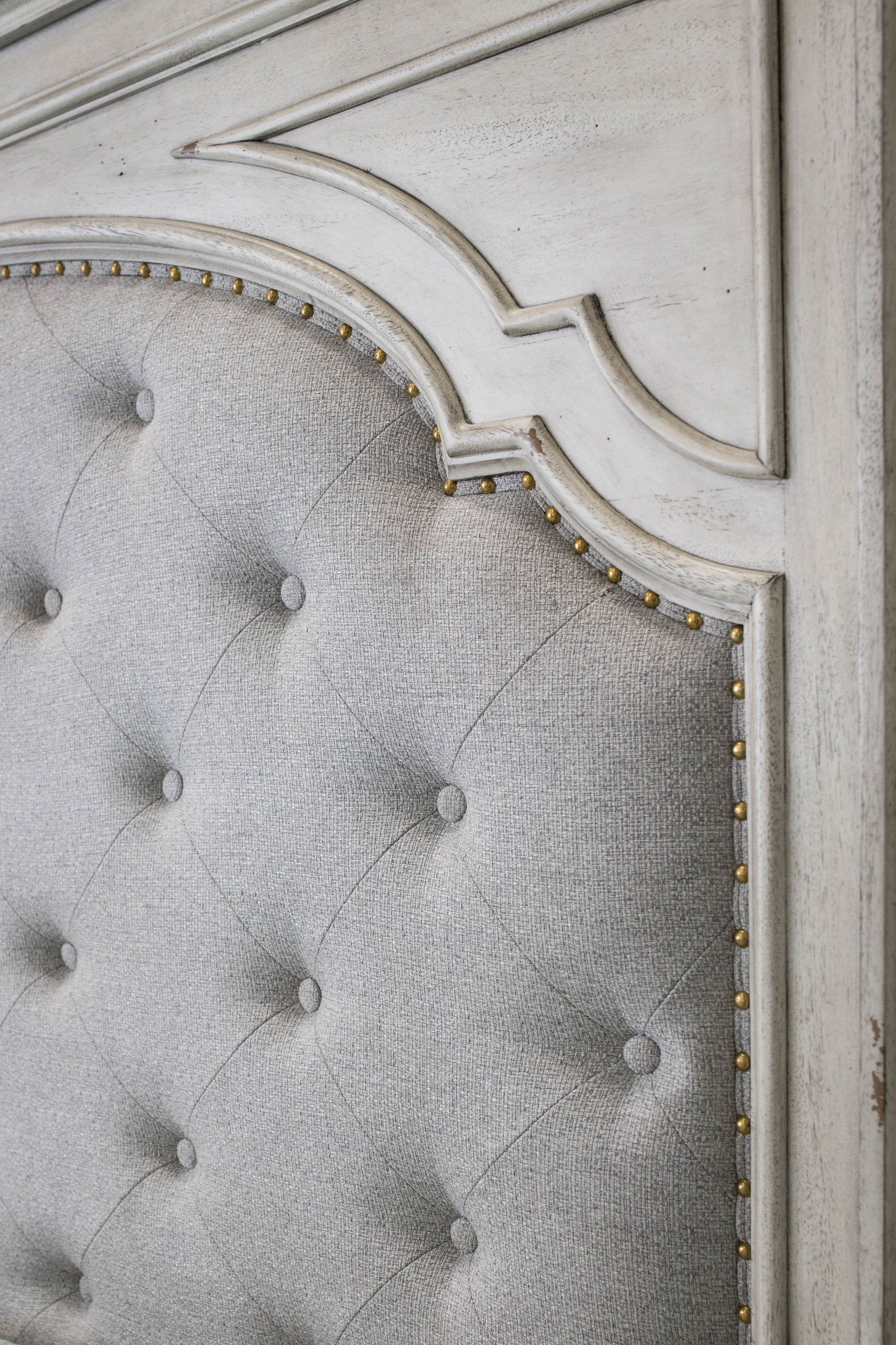 Highland Park features vintage styling in a classical bedroom collection. Sturdy construction using hardwood solids and veneers in a multi-step waxed driftwood finish with the perfect amount of distressing. The Panel bed is highlighted by a tall panel headboard and low footboard accented with heavy crown molding and elegant pilasters. A gorgeous shaped cream grey fabric inset in the headboard features button tufting and antique brass nail head trim. Requires a mattress and boxspring - sold separately.