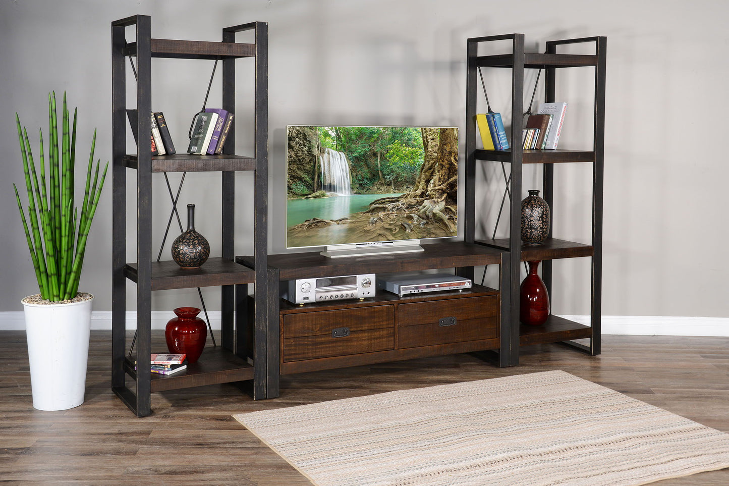 This media wall is a must-have for all entertaining rooms. You to fit an eighty-inch TV within the hutch with its shelf, and an eighty-five-plus inch TV without it. Made in Indonesia with mindi solids and veneers.