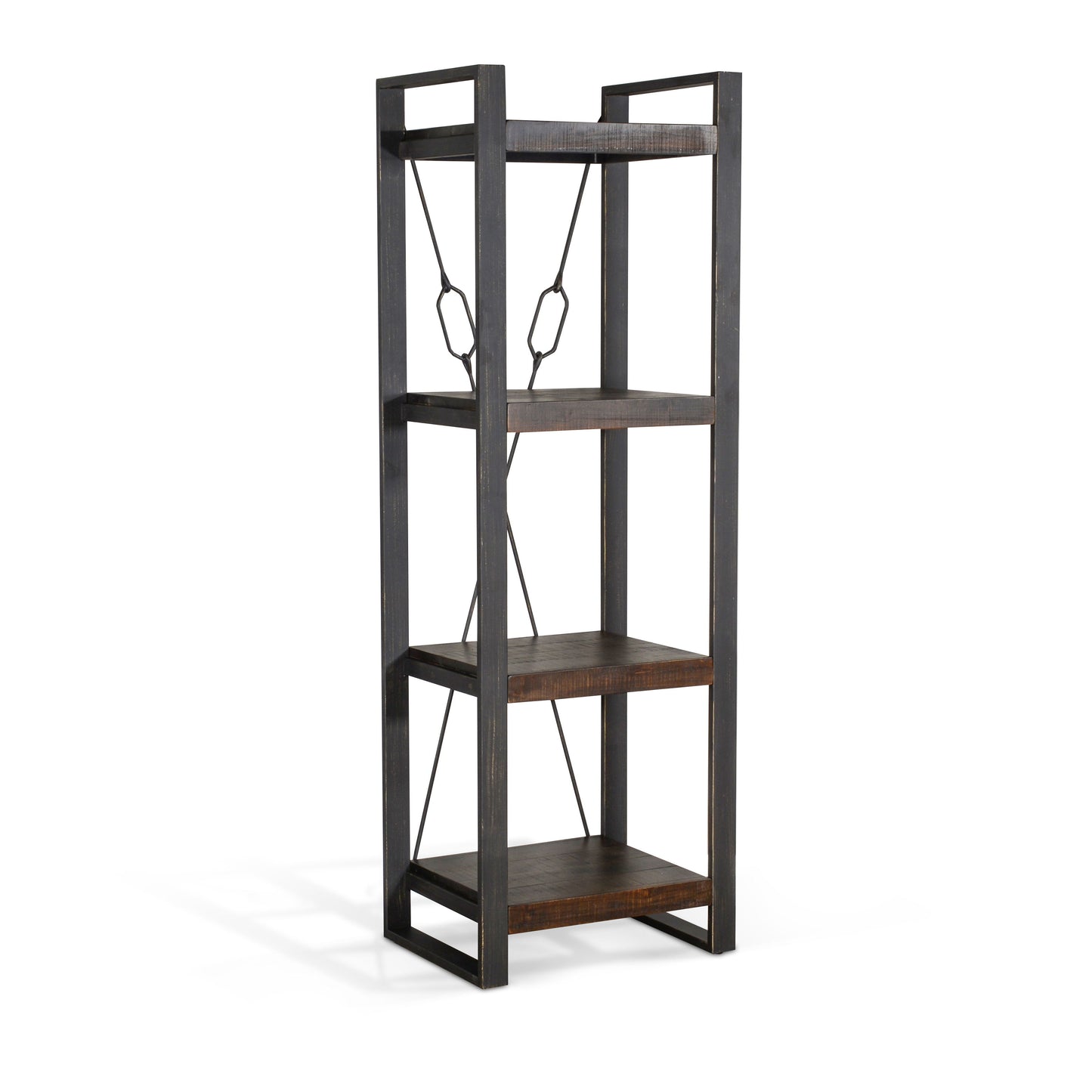 - Industrial design with metal piers, wood shelves and decorative turnbuckles