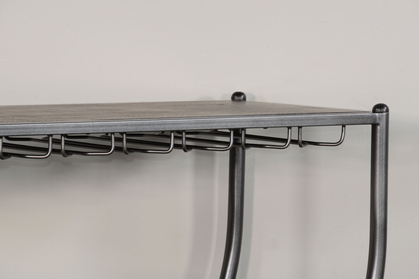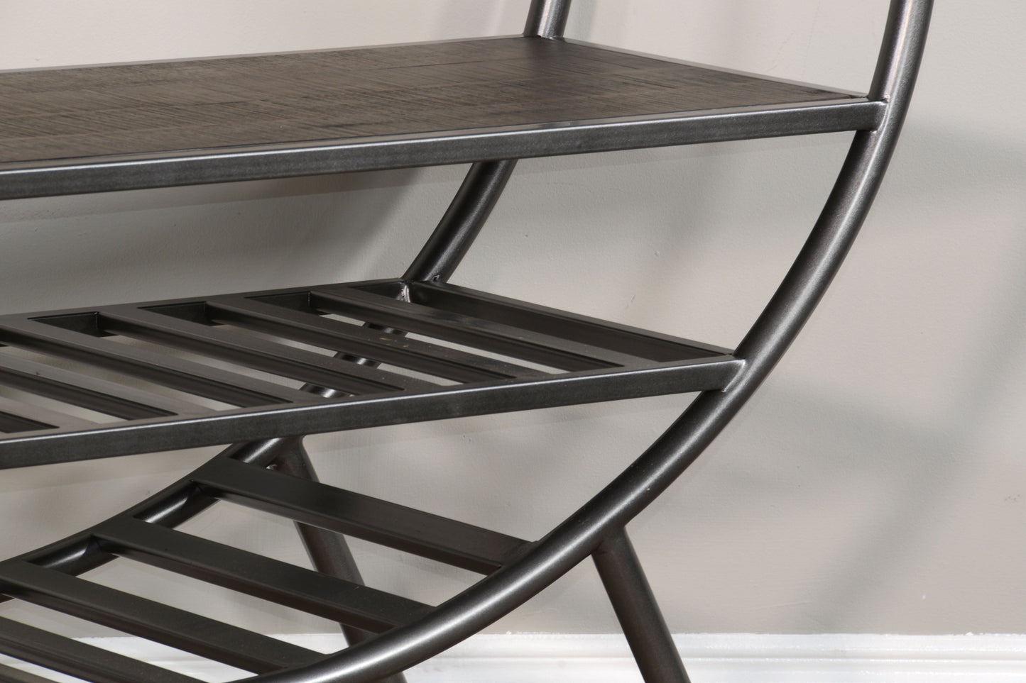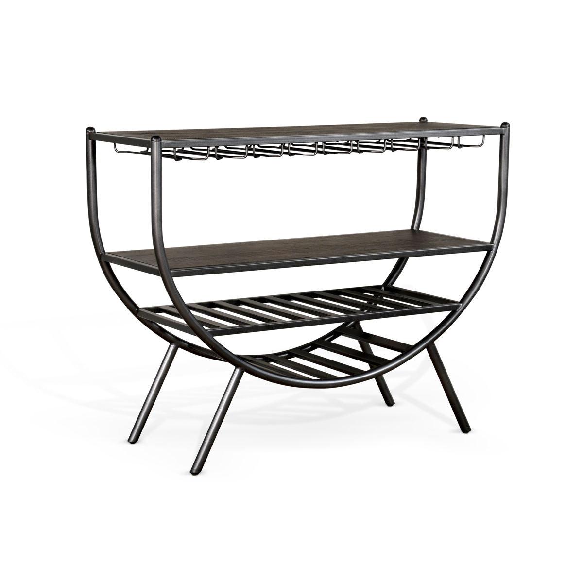 This Homestead wine rack server was built with rough sawn mahogany solids and veneers with wood shelves.
