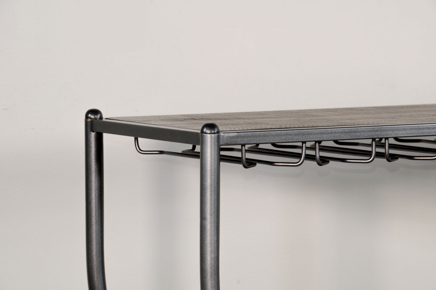 - Slatted shelves for wine bottles and stemware rack under top shelf