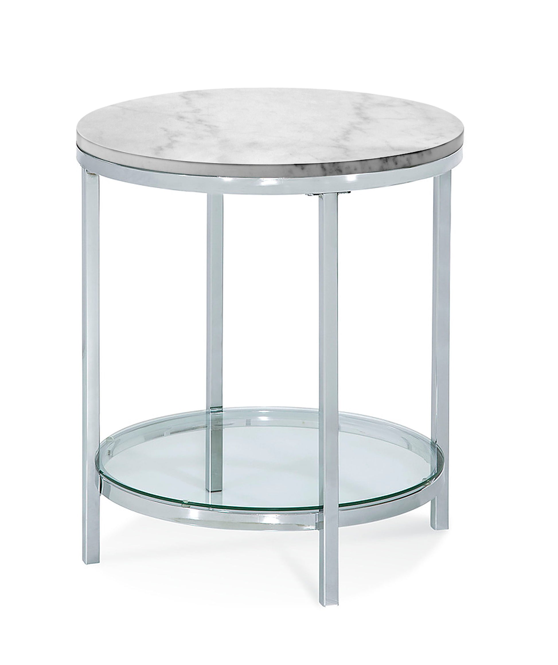 The Jadyn Round End Table is a round table with a white marble top and chrome base.