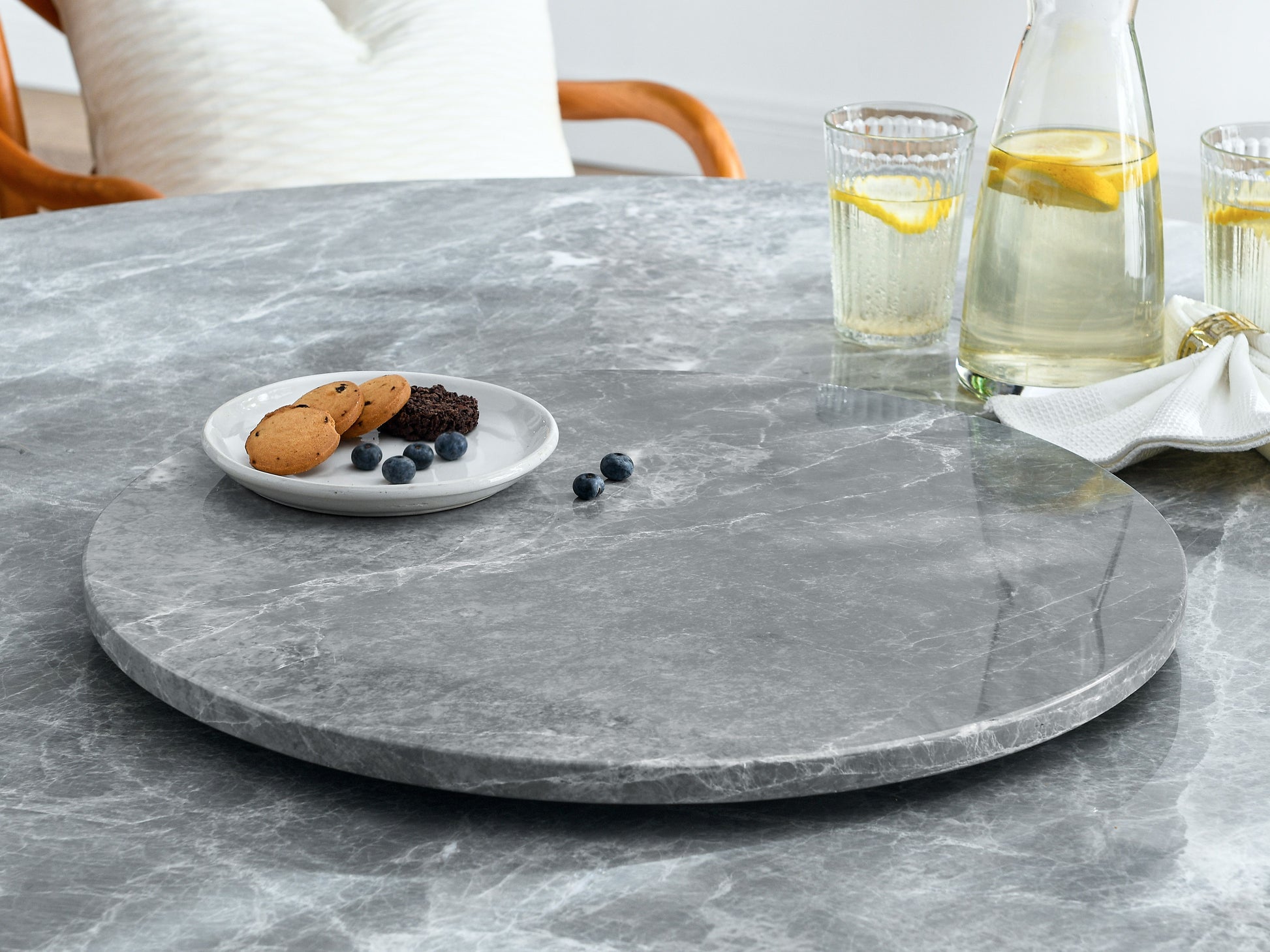 A beautiful and natural accent on any table, the Kaza 18-inch gray marble lazy Susan offers easy and elegant access to dining items for everyone with a smooth and rotating surface. The beauty of marble shines through in this accent that can be used with large round or square marble or wood tables. Fused by nature, each Kaza Lazy Susan is unique so you can rest assured yours is one-of-a-kind.