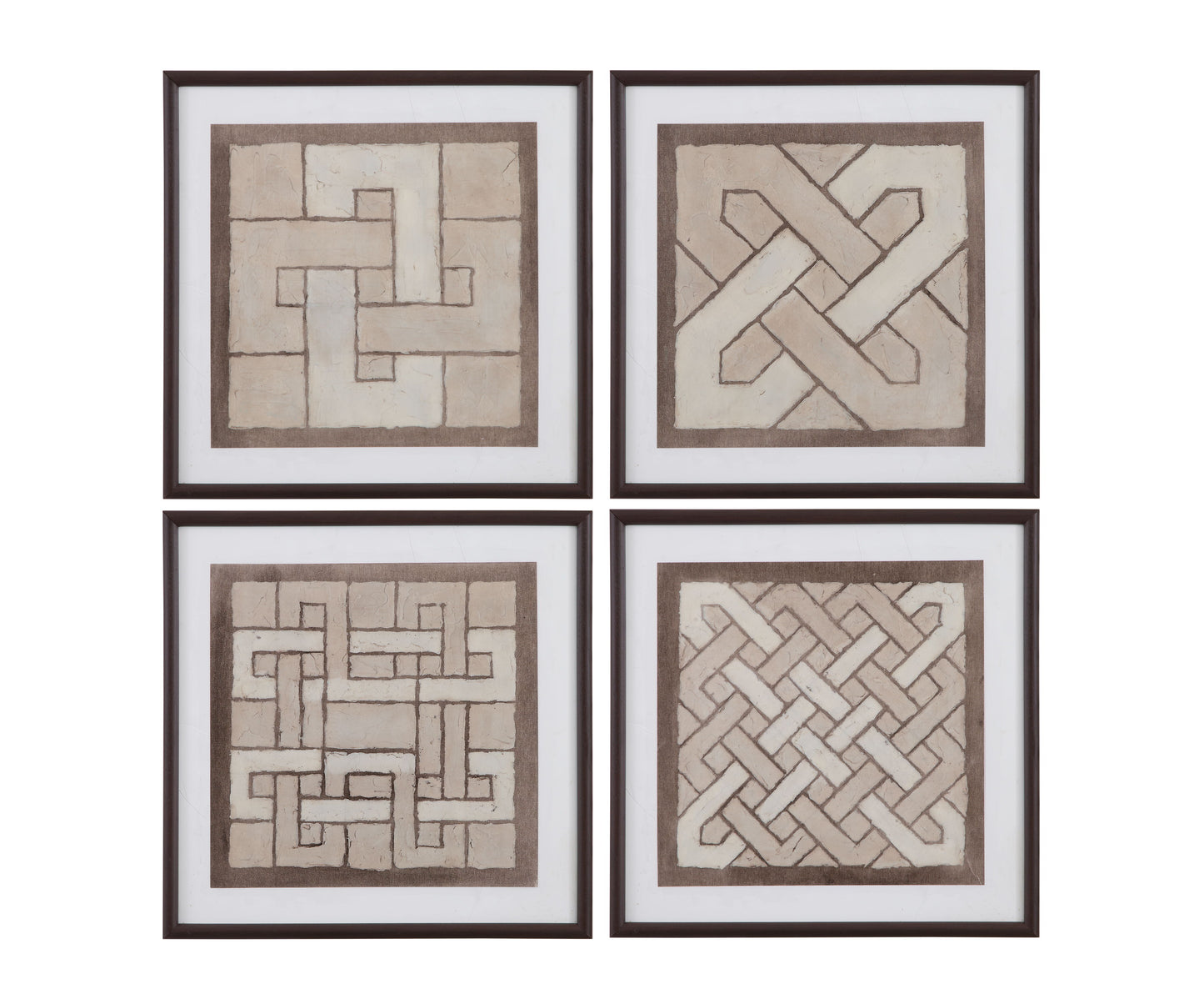 Knotted Tiles is a four piece set of prints framed in a 1" dark brown frame.