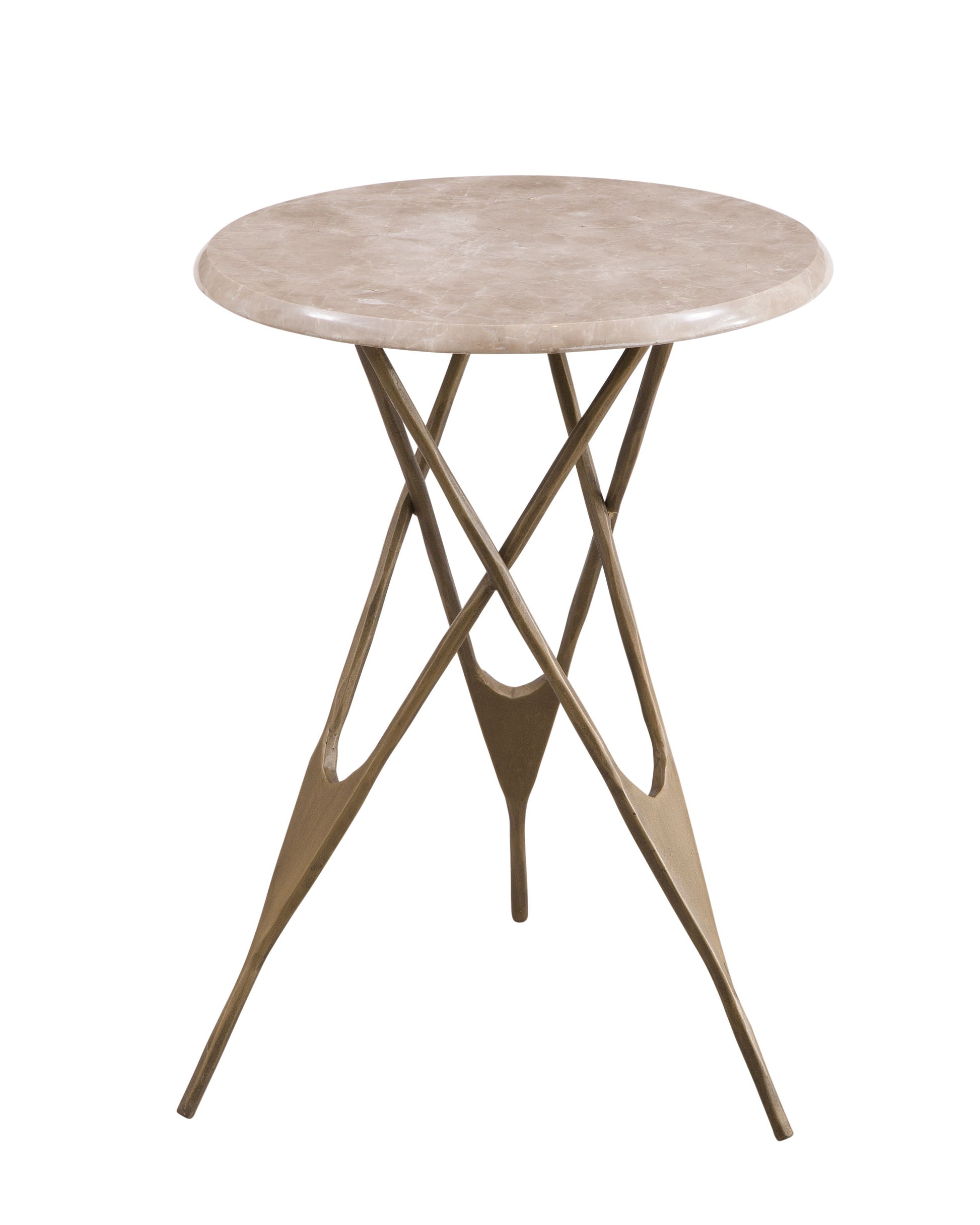 The Leila Accent Table features a glam styling, three-legged solid iron base in an antique brass finish and a solid Italian marble top.