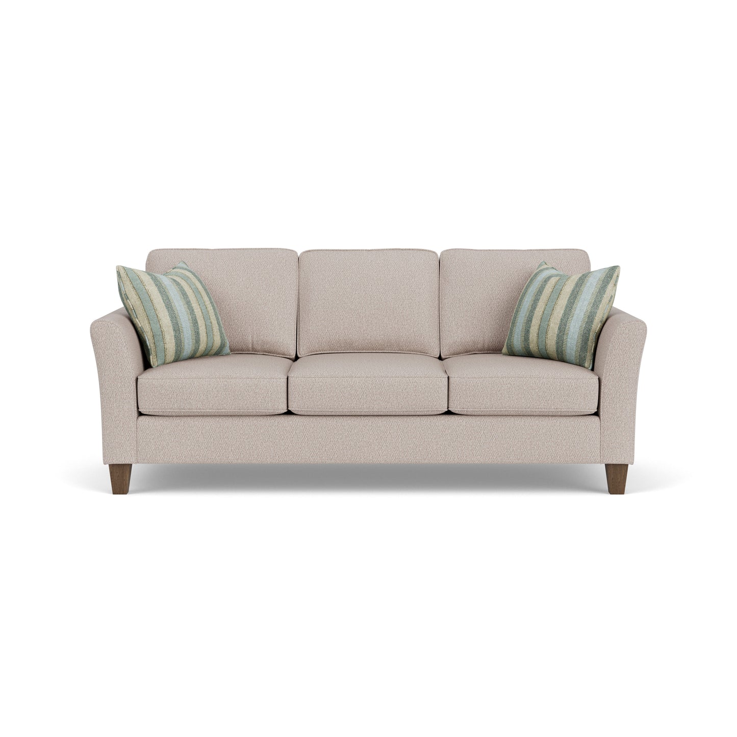 Fit, flared, and artfully paired with traditional style. Libby is a transitional stationary style with clean lines and graceful curves. Its off-the-floor frame is complimented by square tapered legs. This sofa features an elegant roll arm with a detailed welt trim. Two square accent throw pillows are provided. The posh and plush style of Libby fits in with many home décor spaces.