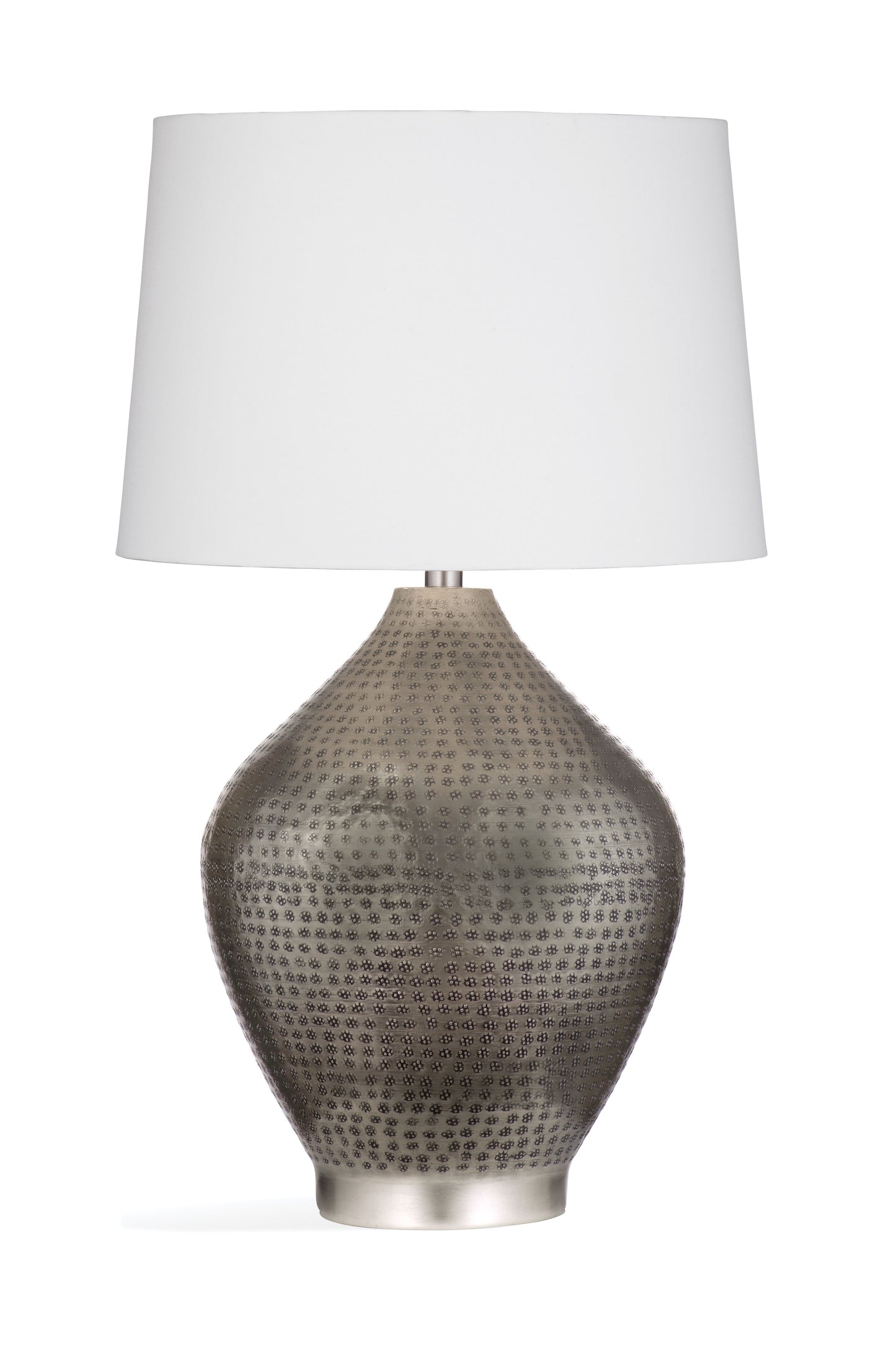 The Lindler Table Lamp has an antique nickel finish with a tapered white cotton shade. The hand crafted details are produced by a skilled artist, lending itself to a unique technique and which may feature slight variations between each piece.