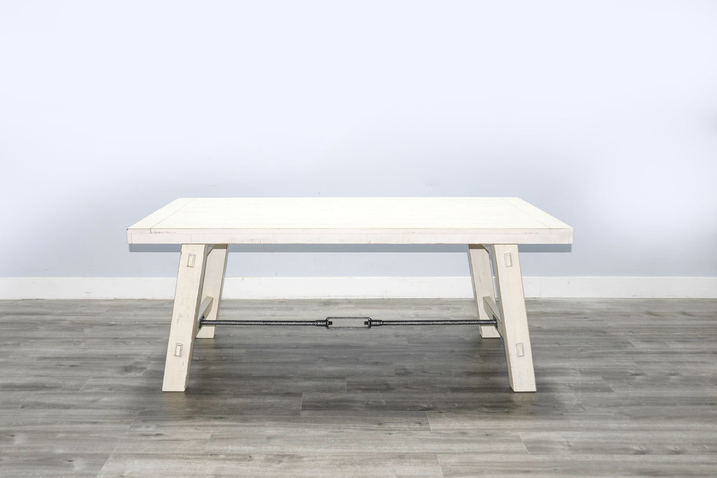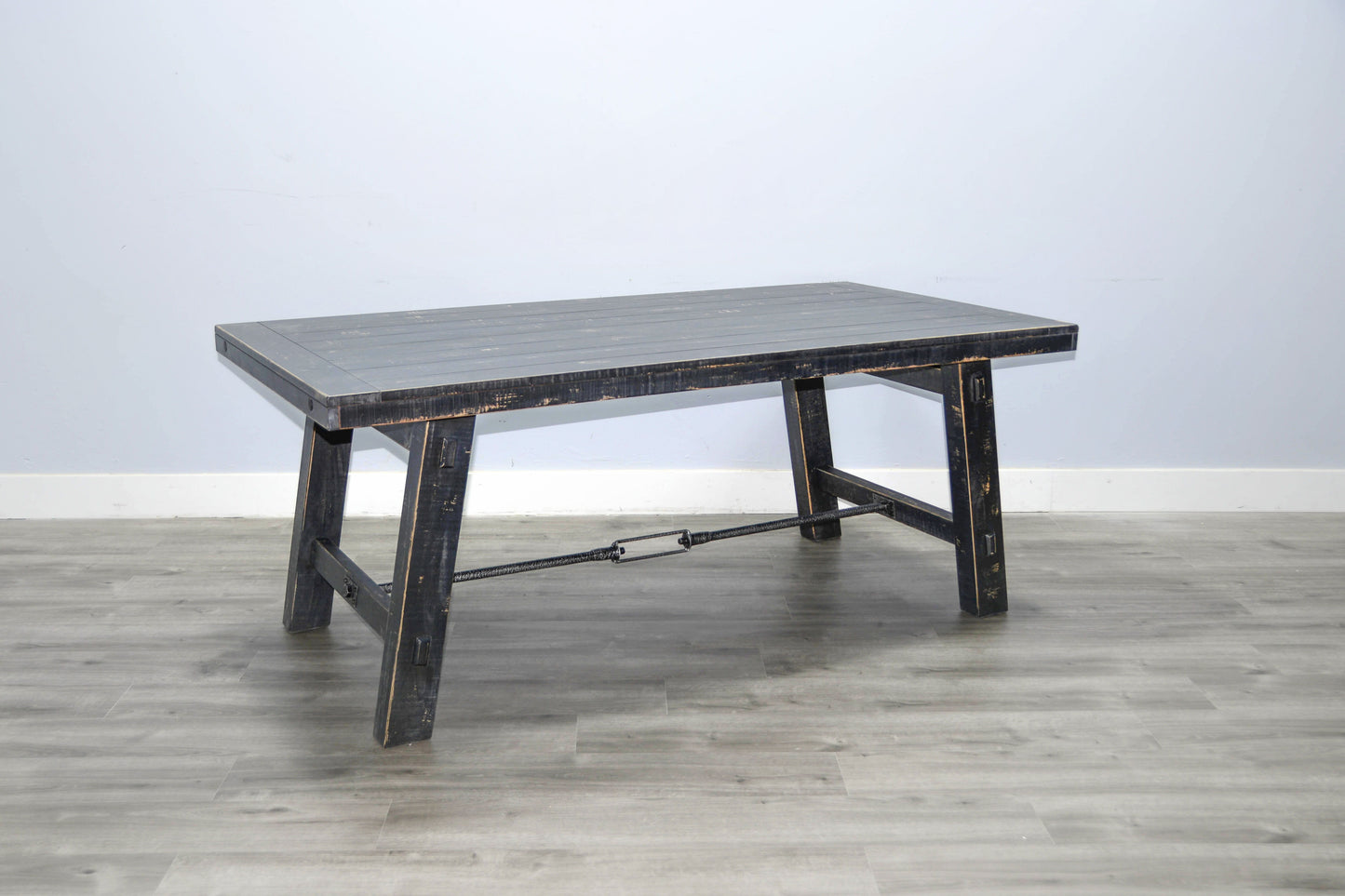 The Marina solid mahogany extension table is a classic statement of craftsmanship featuring rustic turnbuckle hardware.