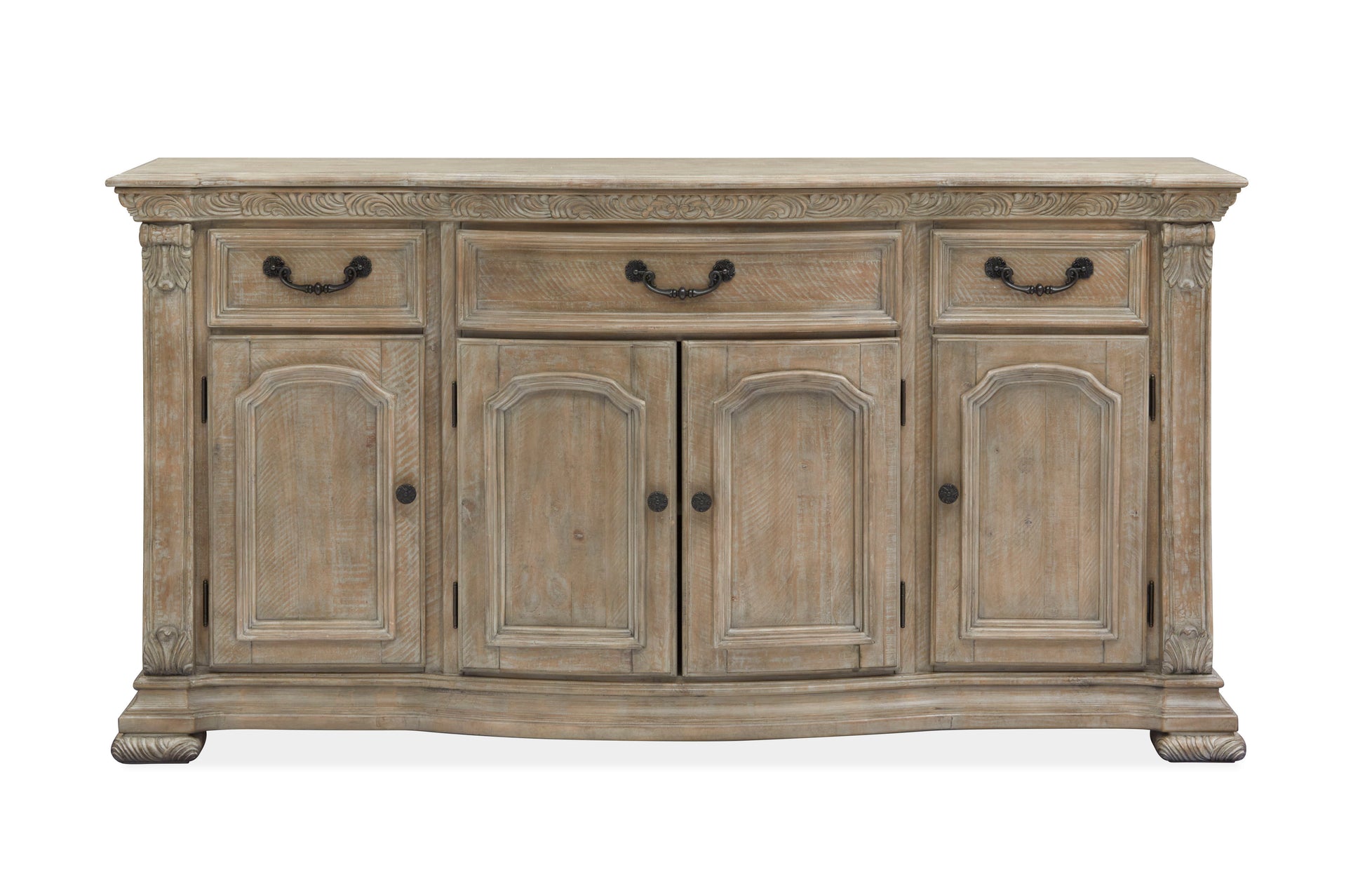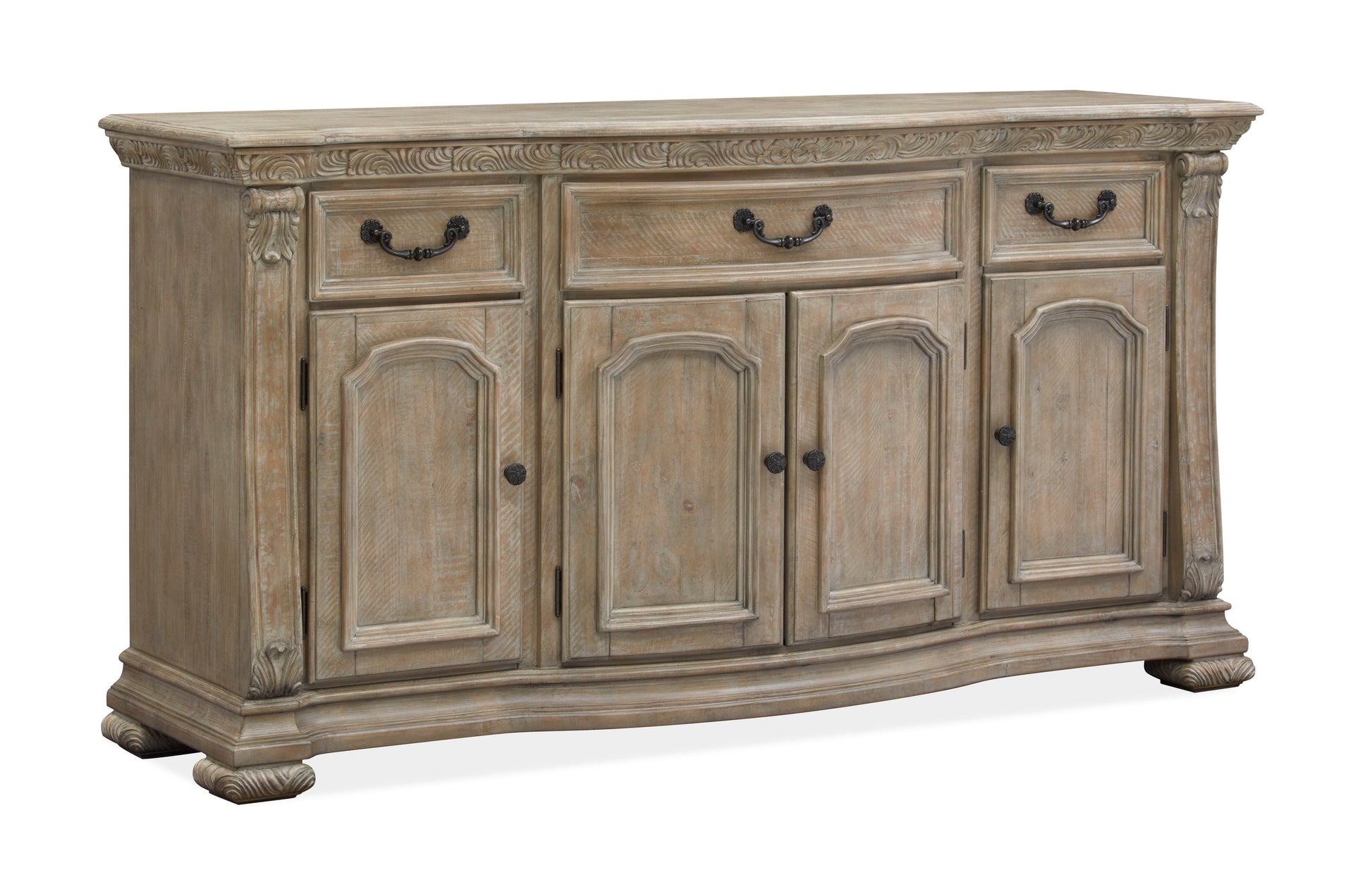 Rooted in Old World design with an updated and relaxed soft Fawn finish, it’s hard to surpass the appeal of the elegant Marisol dining collection. Reminiscent of garden gates, a recurring design element is metal fretwork in a graphite finish on case doors and scrolled metal decoration on the hutch, dining curio and the pedestal base of the 65-inch round dining table. Crafted of Pine Solids, timeless and gracious style elements include fluted pilasters, intricate carvings, a shaped foot and dramatic arch shapes on the curio, hutch and huntboard. Three stunning dining case pieces are offered including a buffet curio, buffet with hutch and a huntboard top featuring diagonal planking behind the 3 wood shelves with plate grooves. The three dining tables include a rectangular table, trestle table with a bottom metal stretcher with rosette decorations and the 56-in round table with metal scrolls on the pedestal base. Dining side chairs include two upholstered-seat chairs, one with a wood fretwork back and one with an upholstered back. Beautifully-scaled host chairs in a classic upholstered wing style are offered with a leg or skirt option. Elevate your interiors with the refined style of Marisol.
