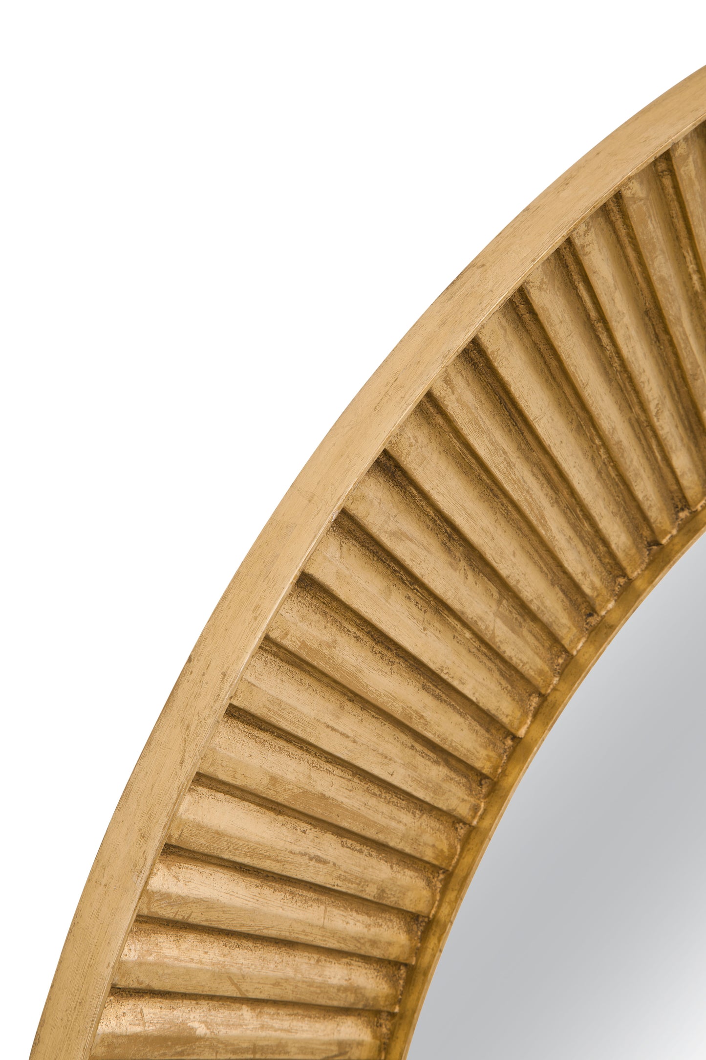 Midtown Wall Mirror is round with a 6" gold sunburst like frame. Finish: gold, clear glass mirror. Material: MDF, clear glass mirror. Mirror Glass Size: 28". Weight: 21 LBS. Wall Mounting: Two "D" ring attachment points for ease of access wall mounting is included to hang mirror. COO: India. The hand crafted details produced by a skilled artist lends itself to a unique technique and will vary slightly.