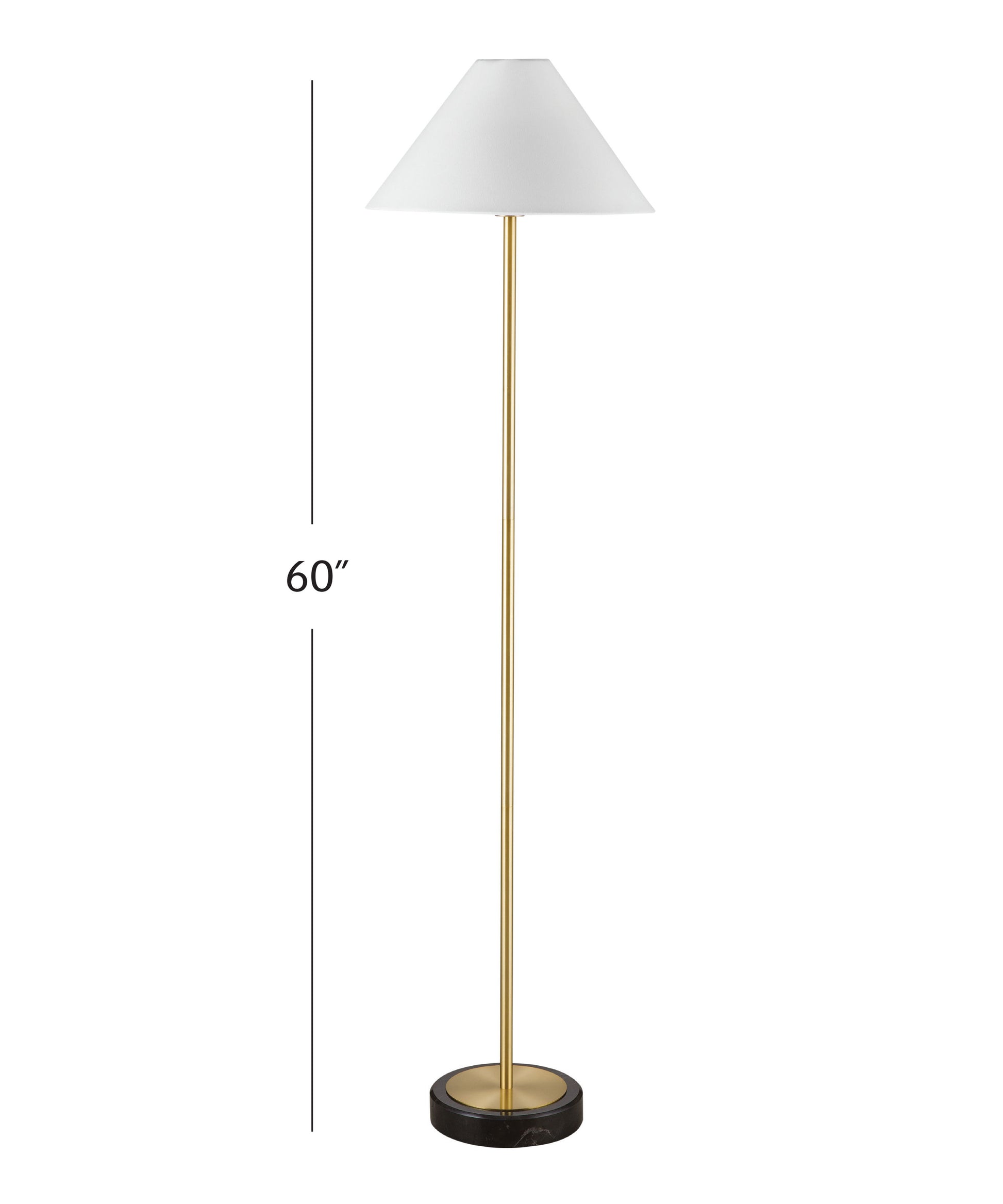 The Norfolk Floor Lamp exudes contemporary glam style, featuring a striking black marble base complemented by a sleek gold brass body. Its cone-shaped lamp shade, crafted from white metal, adds a sophisticated touch to any room. With its modern and timeless design, this lamp effortlessly combines elegance with functionality.
