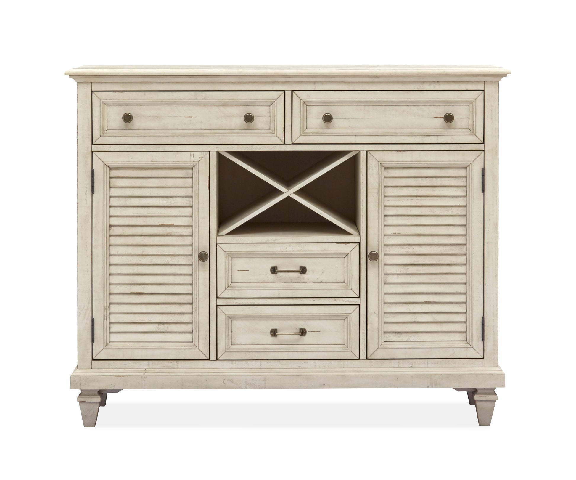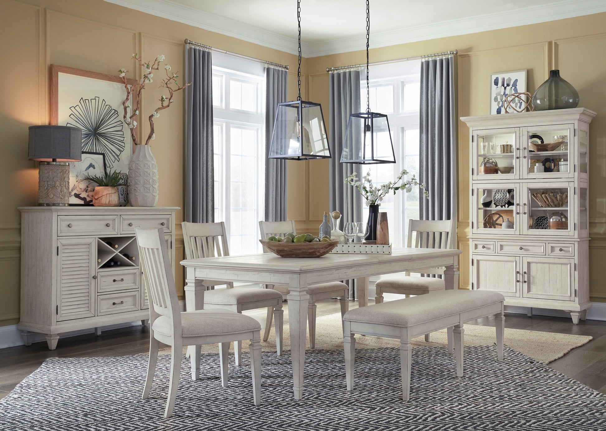 Inspired by the architecture and landscape of California Wine Country, the Newport dining collection exudes the ambience of laid-back luxury. Crafted of high-low Pine and Hardwood Solids, the soft Alabaster finish and Brushed Pewter hardware mix effortlessly with graceful turned legs and designer details to create a look that is bold yet inviting. Adding a casual classic and coastal resort flair, shutter wood doors are used on the server, and two shutter doors are also on the base of the counter table, with adjustable shelves behind. The distinctive piece selection includes a buffet, server and a dining cabinet with two wood-framed glass doors on the top and two on the bottom, offering 3-way touch lighting control with 2 LED lights. The table options include a 52-inch round and a 68-inch rectangular leg table. The tables can be extended to 70 inches and 86 inches, respectively, with use of a leaf. The rectangular counter table extends to 58W x 36H when the butterfly leaf is used. The versatile seating options include a side chair with upholstered seat and wood slat back, an upholstered seat and back chair, a bench with upholstered seat and wood trim, an elegant shaped chair with wood trim and upholstered seat and back, and counter-height dining chair with upholstered seat and slat back. Relax and unwind as you anticipate your favorite decision of the day: whether to open red or white.