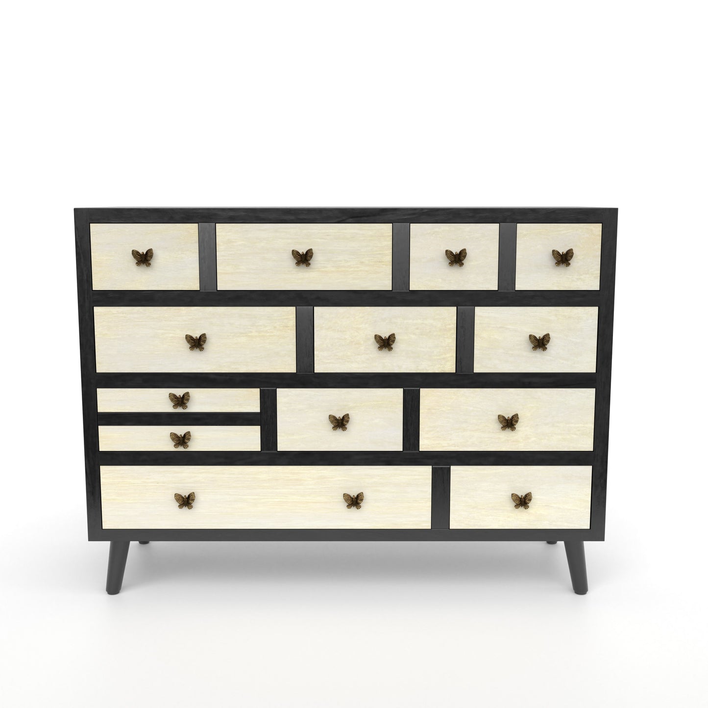 Papillon adds a little whimsy and a lot of function to any room with this 13-Drawer Accent Sideboard. Antiqued brass butterfly pendants serve as the hardware on this artisan-crafted ebony and washed ivory finished cabinet that will bring a welcome design accent to any room. The asymmetrical drawer design lends visual interest to the piece while offering a generous storage platform for different sized items.