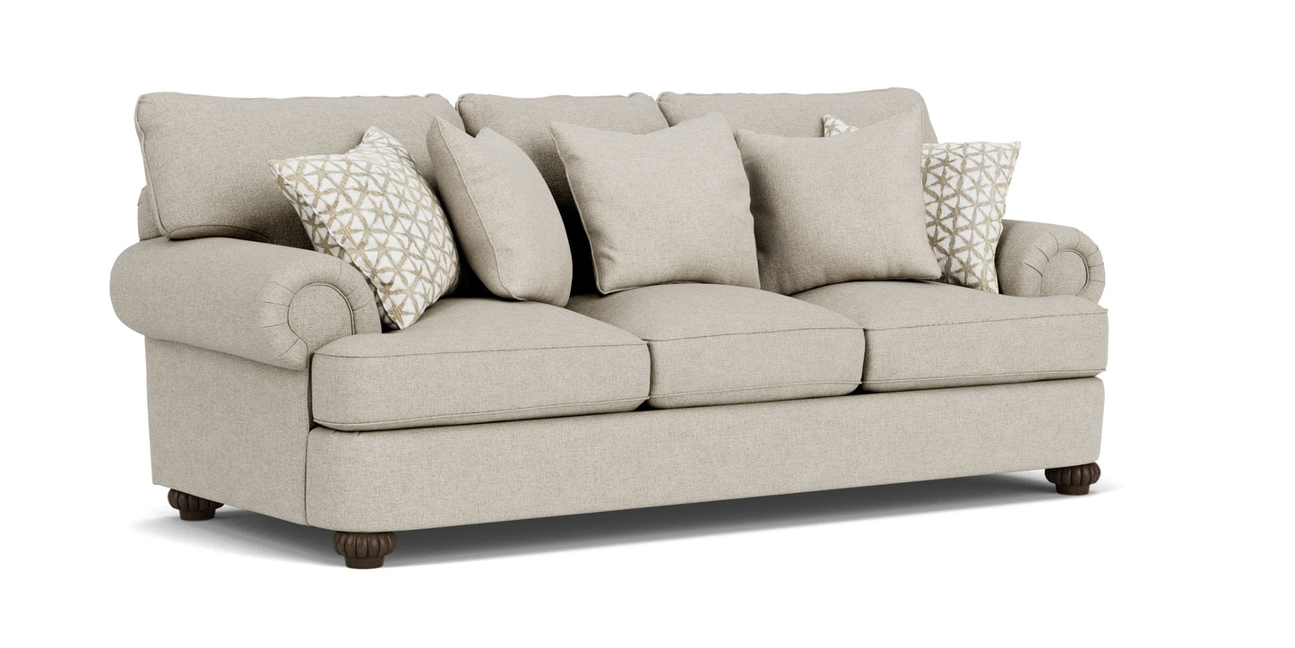 Generous proportions in an elegant design. Prominently rolled arms and a padded front rail give Patterson its welcoming appearance. Overstuffed seat and back cushions on a large frame make it difficult to resist curling up on this piece. Fluted bun feet and optional nailhead trim add the finishing touches to Patterson.