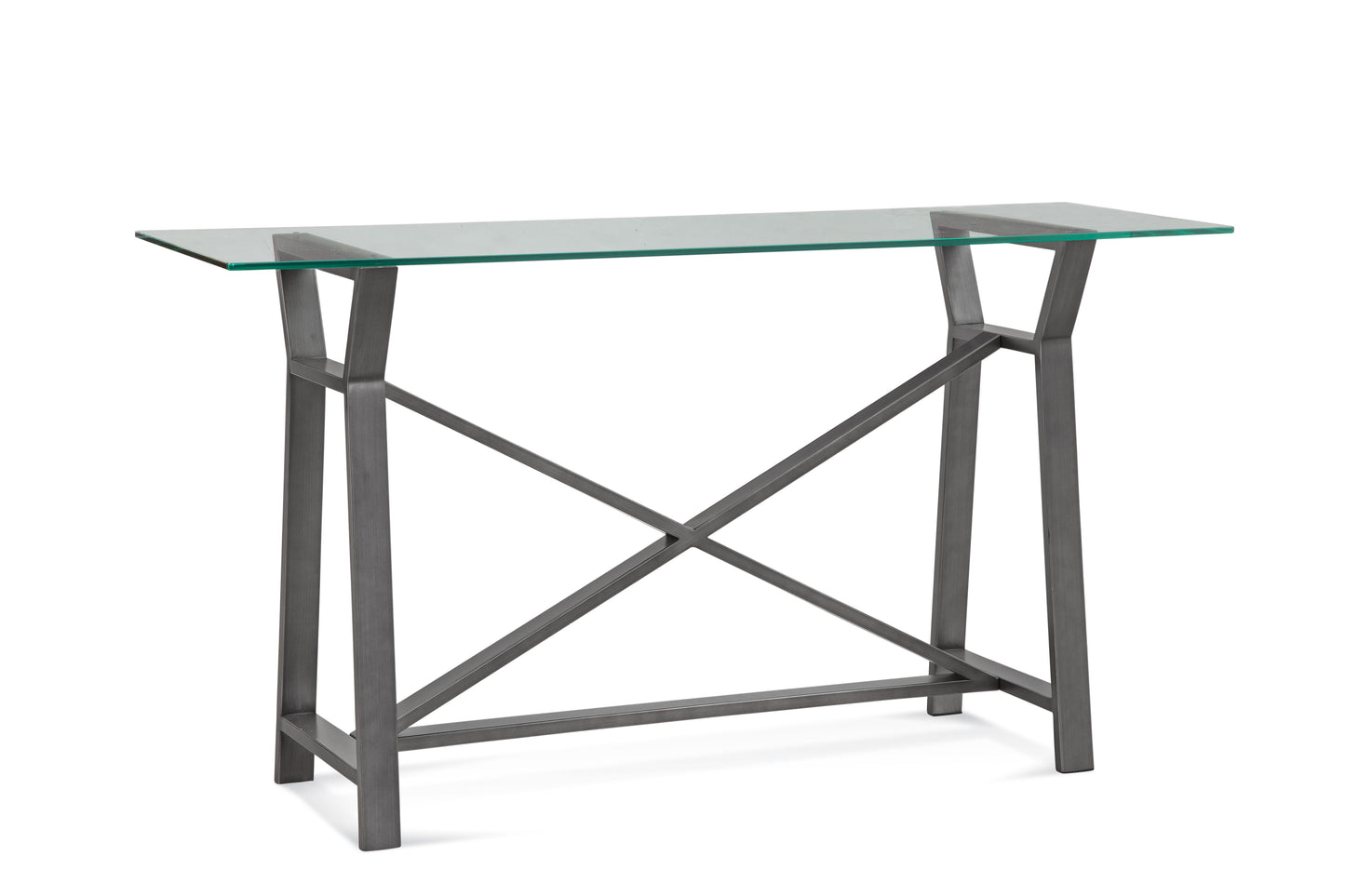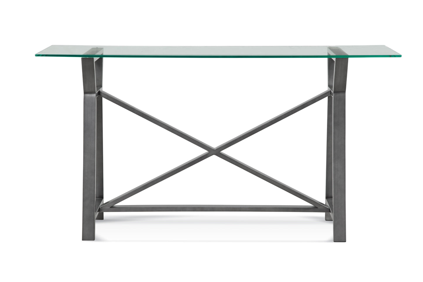 The Ross Console Table features a metal X cross base design. Finish: hand-brushed pewter. Material: powder coated steel, clear glass. Adjustable floor levelers.