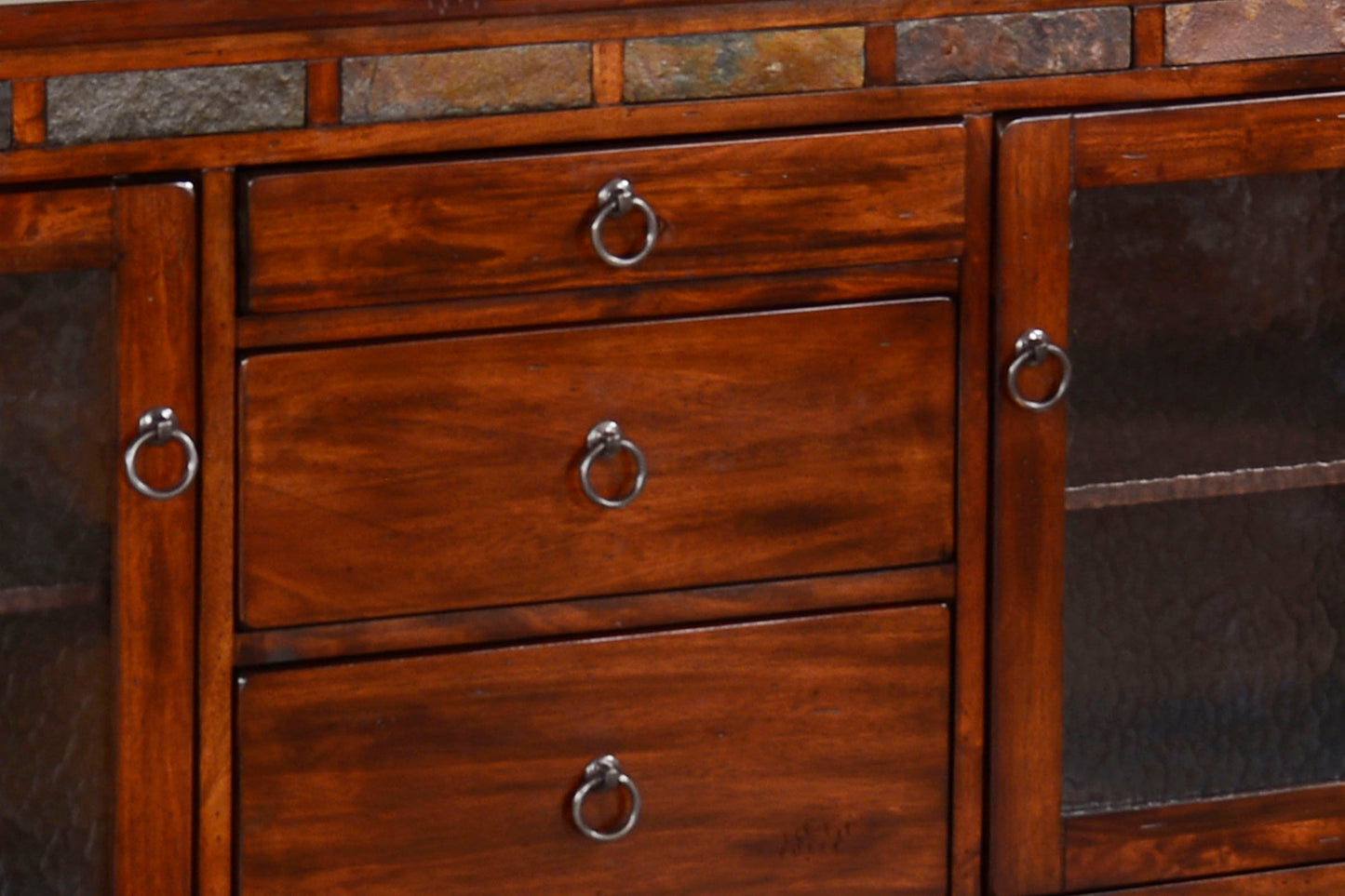This entertainment wall is the choice for any living room or family room. Its elegance appeals to most traditional or eclectic decor styles. Notice the ring pull hardware and its slate aprons; how they stand out and yet flow with the gorgeous wood grain.