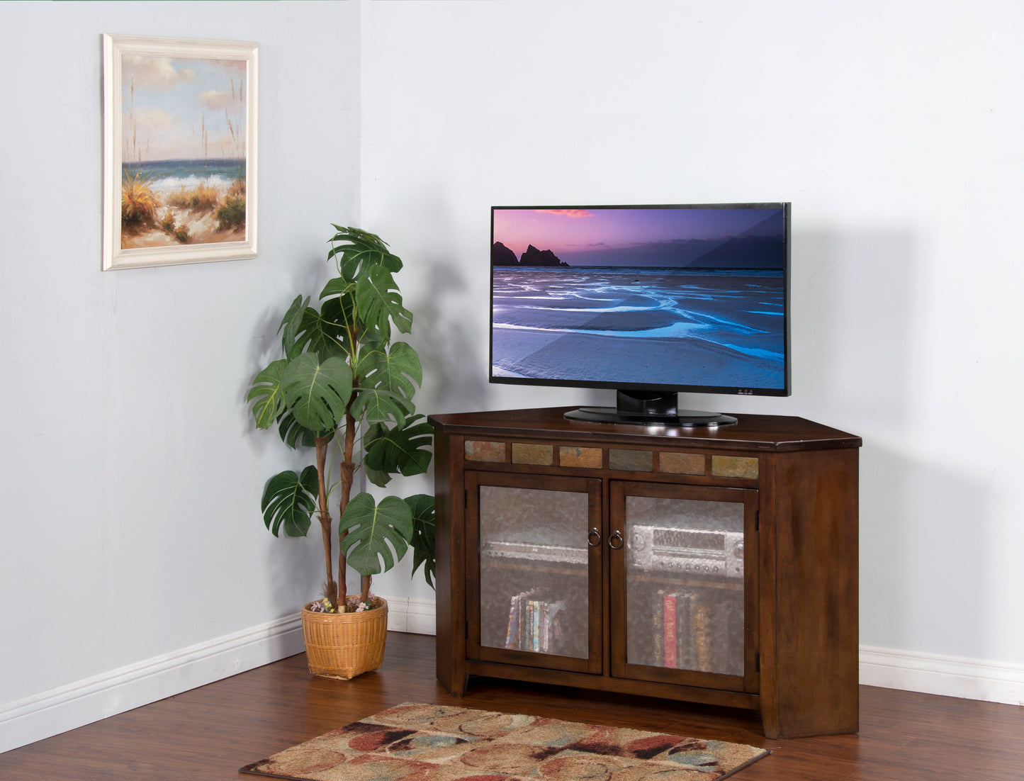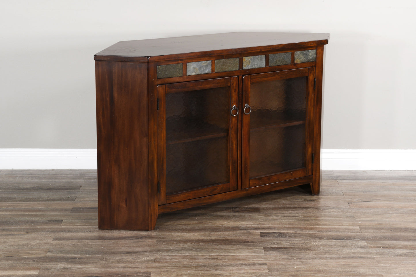 This Santa Fe corner TV console was made with wave glass door panels, distressed mahogany solids and veneers, and natural slate with two adjustable shelves.